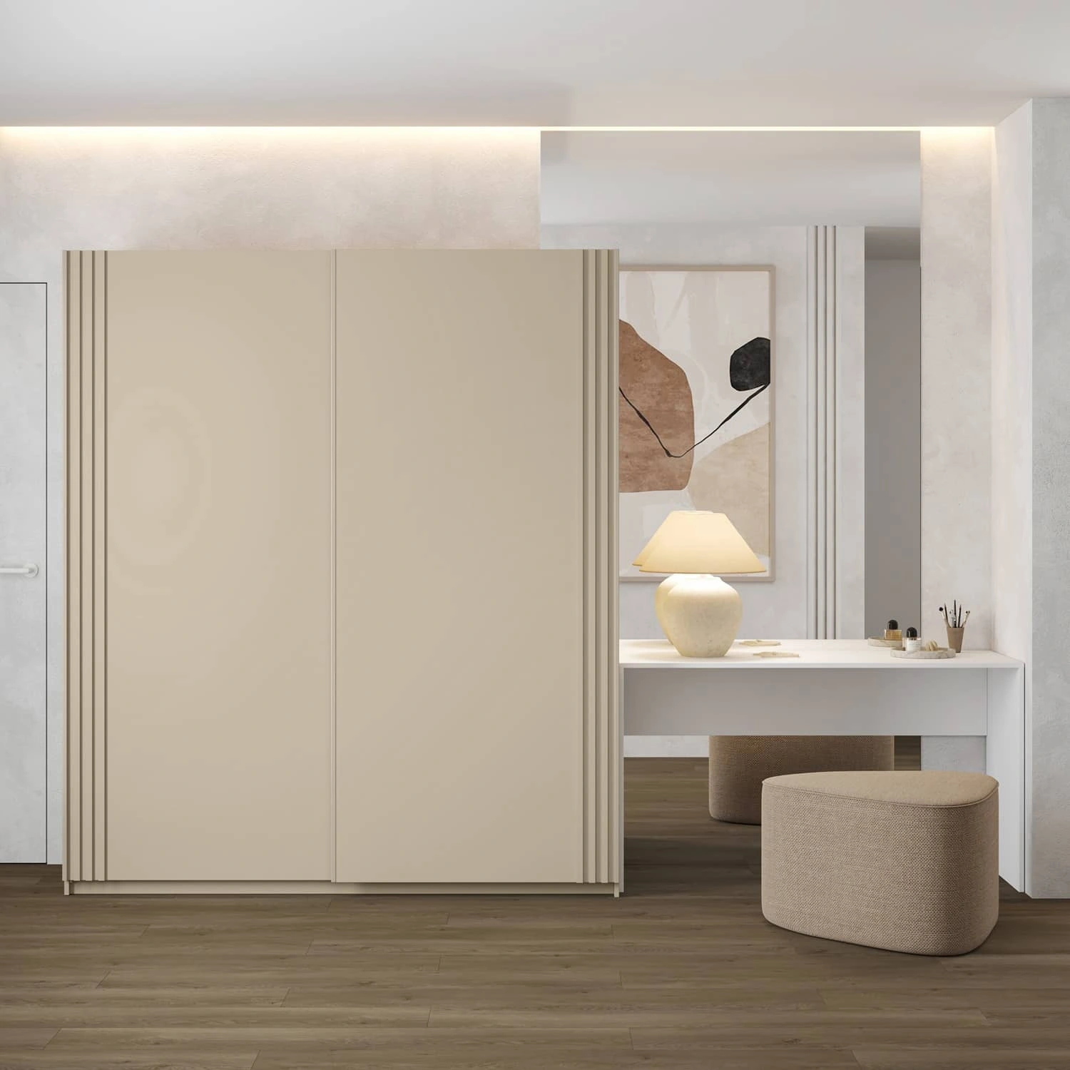 Posuvná šatní skříň Niva 180 cm béžová prostorná šatní skříň zdobená lamelami je ideální pro místnosti jakékoli velikosti