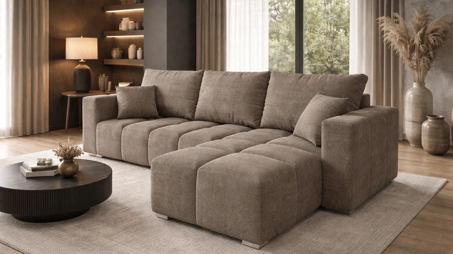 Rohová sedací souprava s funkcí spaní Linco tmavě béžová univerzální moderní rohová sedací souprava do obývacího pokoje strukturovaná látka se zajímavým povrchem