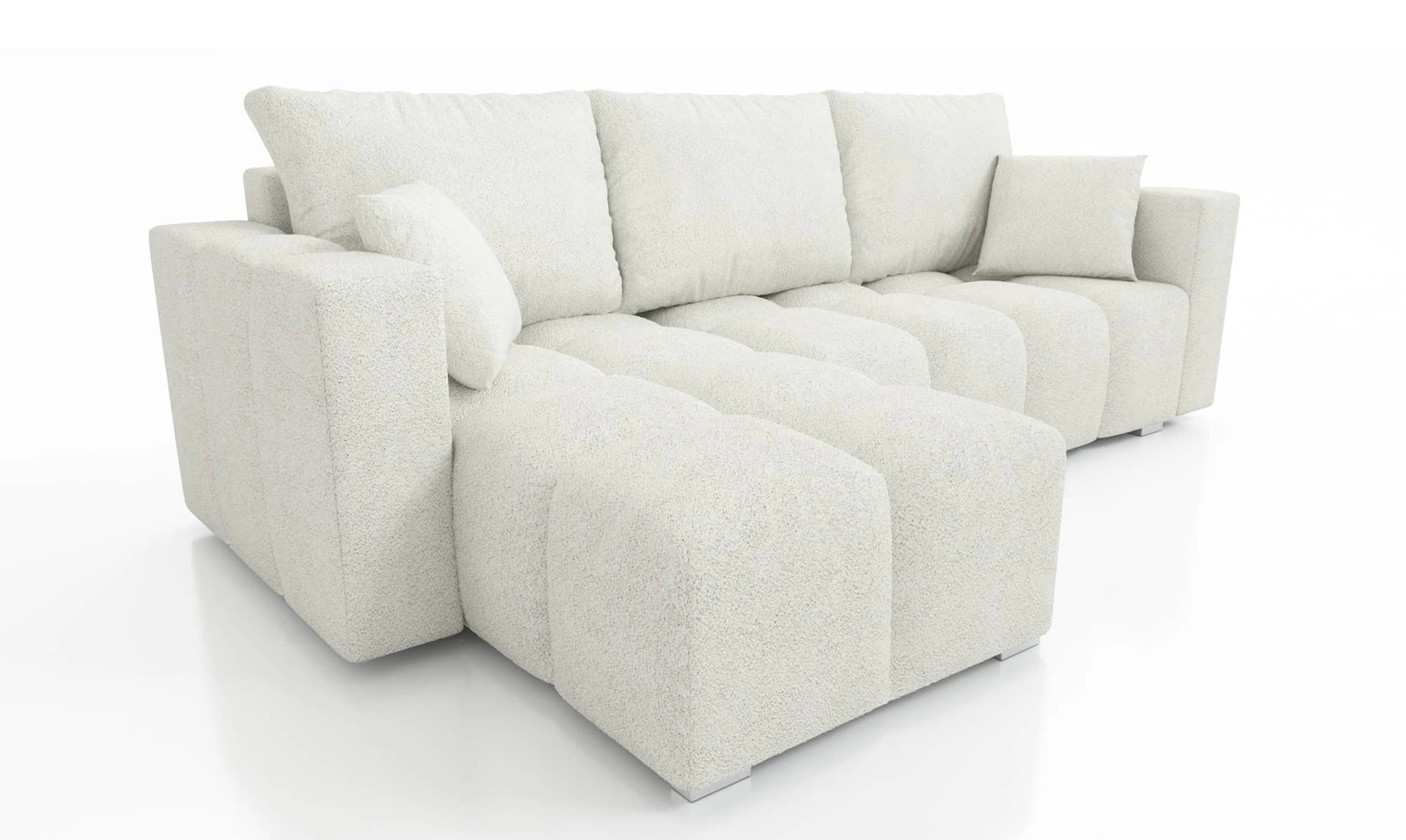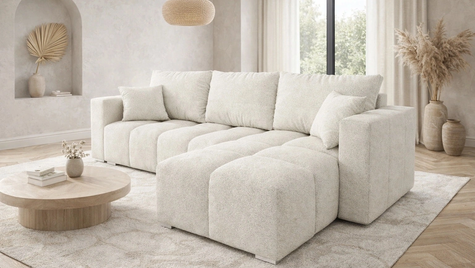 Rohová sedačka s funkcí spaní Linco krémová univerzální rohová sedačka do obývacího pokoje s moderním designem z látky boucle