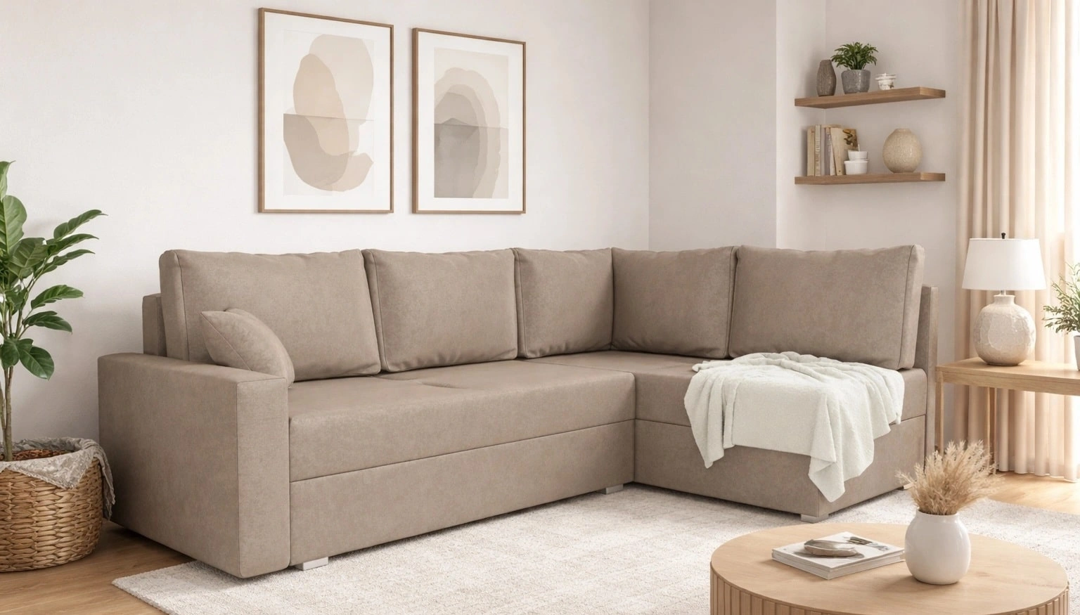 Rohová sedací souprava s funkcí spaní Nofi tmavě béžová pravá strana moderní design jednoduchý a stylový korpus, který se hodí do každého interiéru