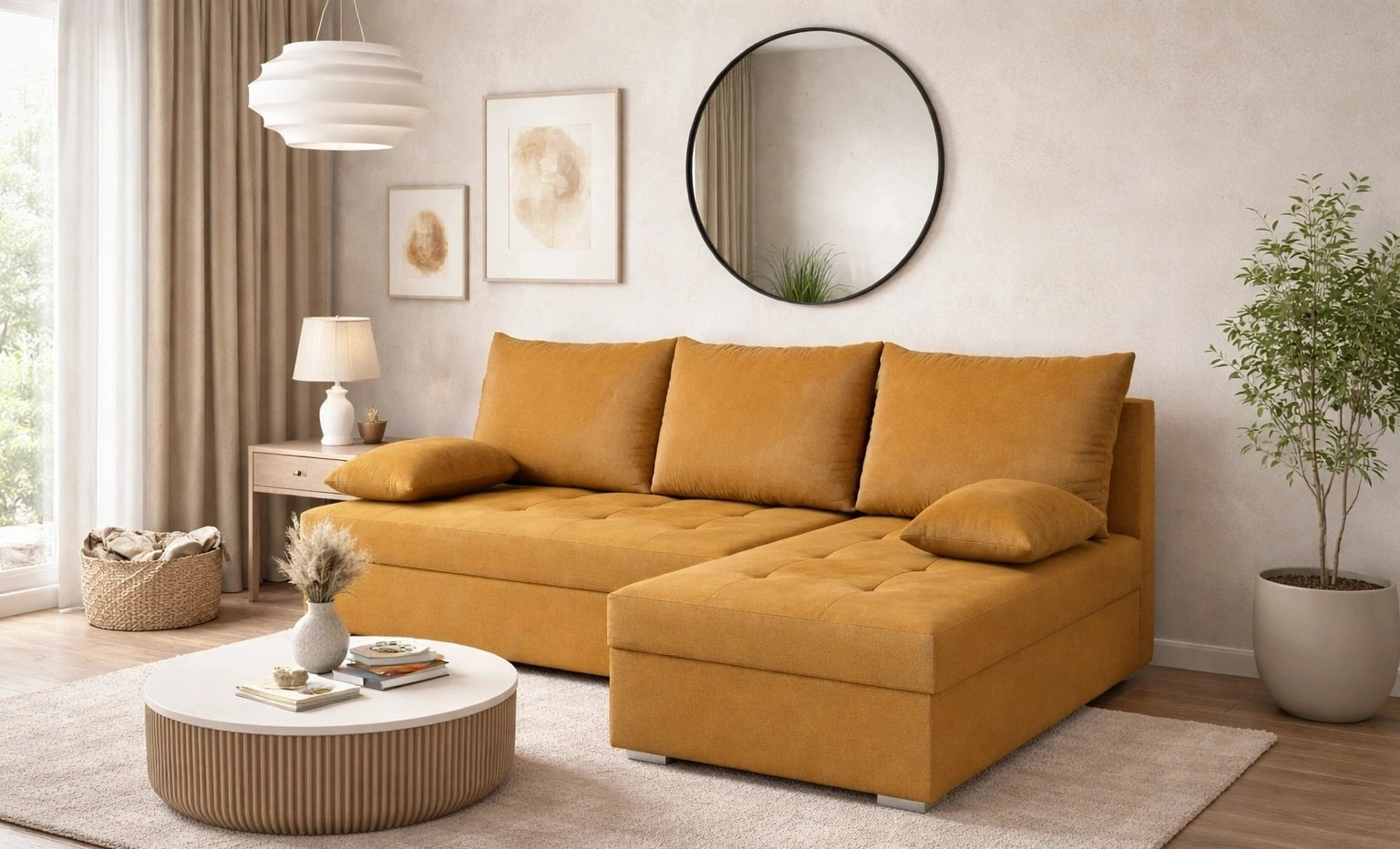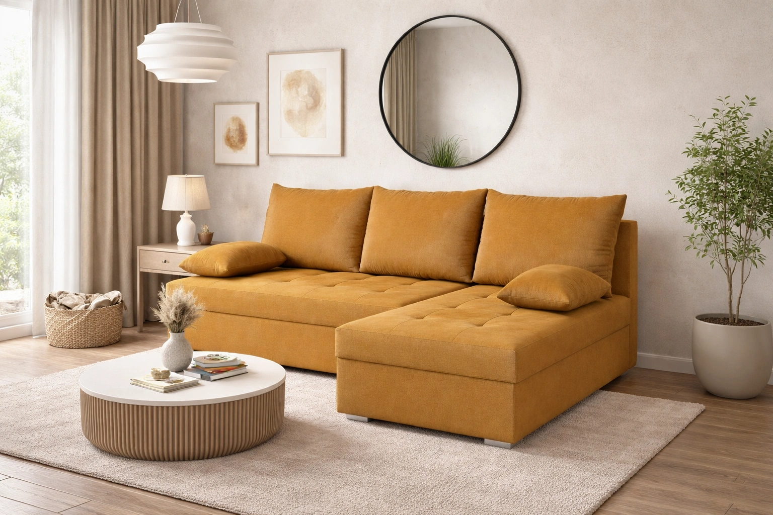 Fasti corner v hořčicové barvě je ideálním řešením obývacího pokoje, které se hodí do každého interiéru.