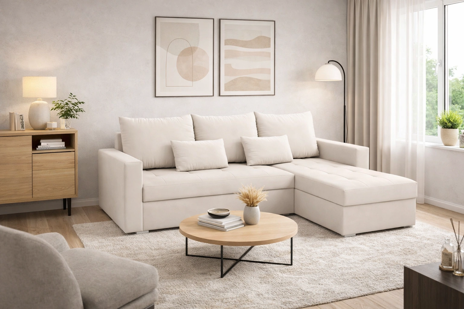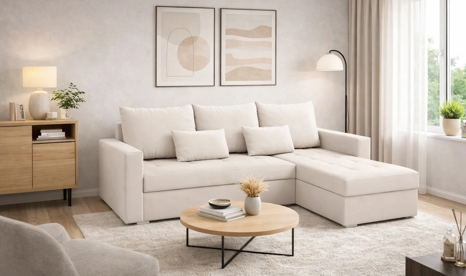 Rohová pohovka Fasti Bis ve světle béžové barvě je ideálním řešením pro obývací pokoj, které se hodí do jakéhokoli interiéru.
