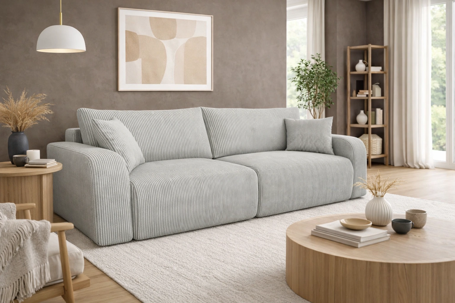 Pohovka Fiesta světle šedá funkční pohovka do obývacího pokoje s úložným prostorem na lůžkoviny elegantní design manšestrová tkanina
