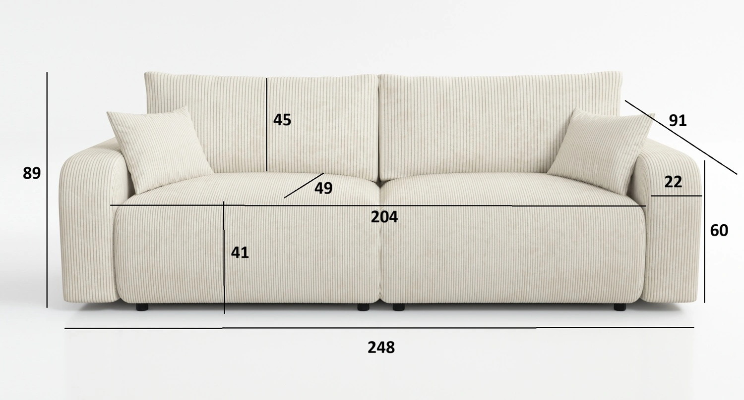 Rozložení celé spací plochy je velmi snadné a nevyžaduje velkou sílu. Sedadlo je rozkládací na dřevěných ližinách. Plocha pohovky na spaní je 138x204 cm. Nábytek je vybaven nízkými plastovými nožkami. Tato funkční pohovka se hodí do jakéhokoli typu místnosti. Zaručuje pohodlné a bezproblémové používání a trvanlivost celého nábytku po mnoho let používání. Ideální jako pohovka do obývacího pokoje, pohovka s funkcí spaní a do jakéhokoli interiéru zařízeného ve vašem oblíbeném stylu.