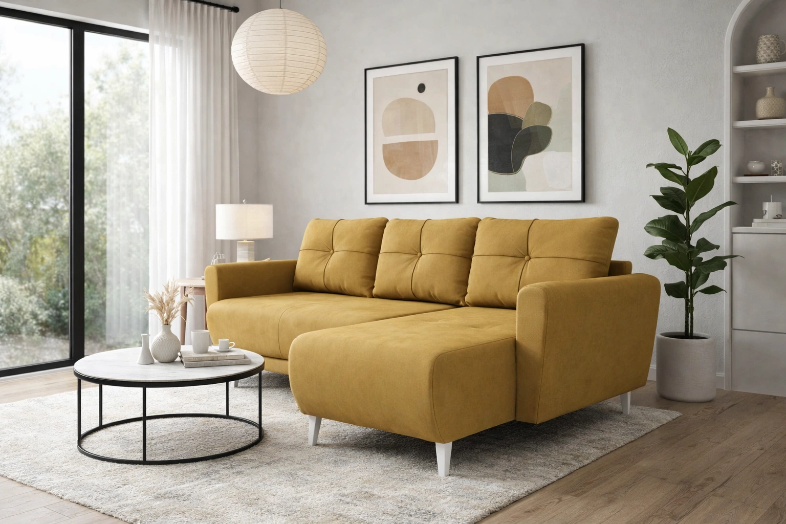 Rohová pohovka Felicie v hořčicové barvě je stylový kousek, který se bude dobře hodit k jakémukoli interiéru vaší domácnosti.