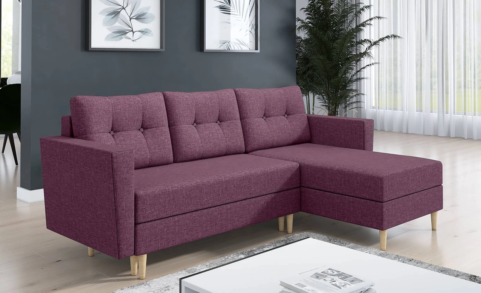 Rohová sedací souprava s funkcí spaní Telsze fialová univerzální elegantní rohová sedací souprava ve skandinávském tvaru velký prostor na lůžkoviny