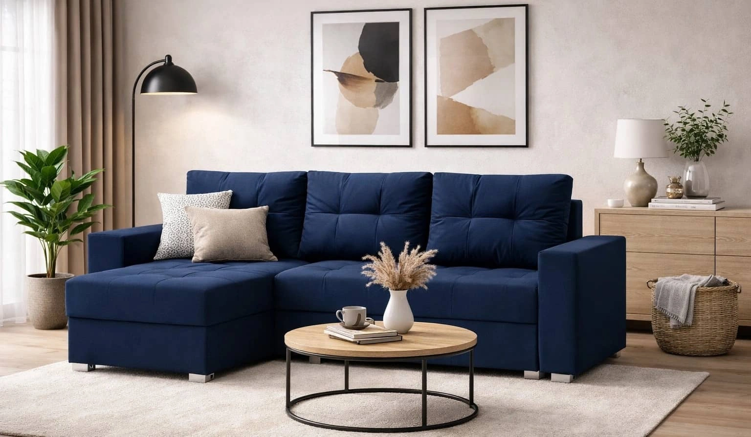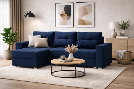 Rohová pohovka Pablos v tmavě modré barvě je ideálním řešením pro obývací pokoj, které se hodí do jakéhokoli interiéru.
