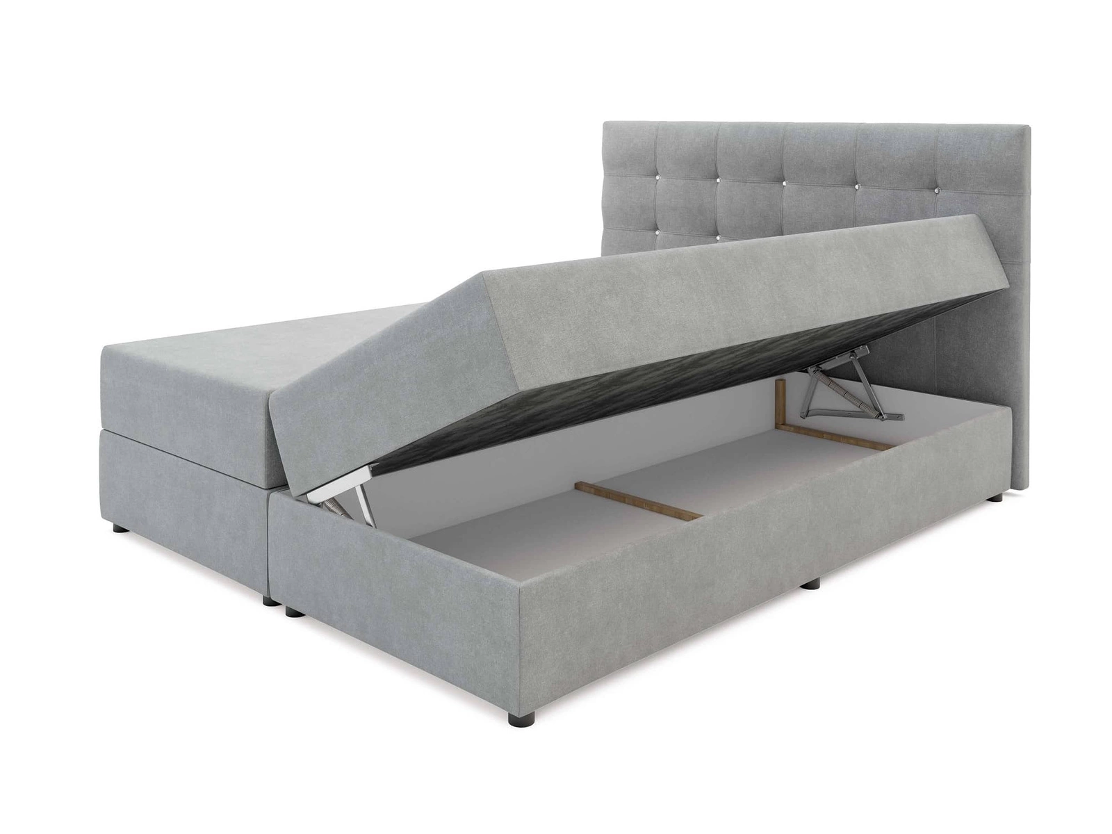 Dalšími výhodami čalouněné postele Kingston jsou dva velké kontejnery. Přístup k přihrádkám je možný zvednutím matrace. Spolehlivé automatické zvedací pomůcky usnadňují tuto činnost.