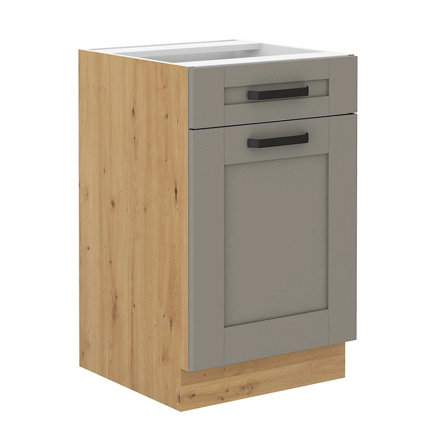 Stojící kuchyňská skříňka Linosa se zásuvkou v šedobéžové barvě / dub artisan patří do kategorie modulárního kuchyňského nábytku, ze kterého lze vytvořit libovolnou sestavu.