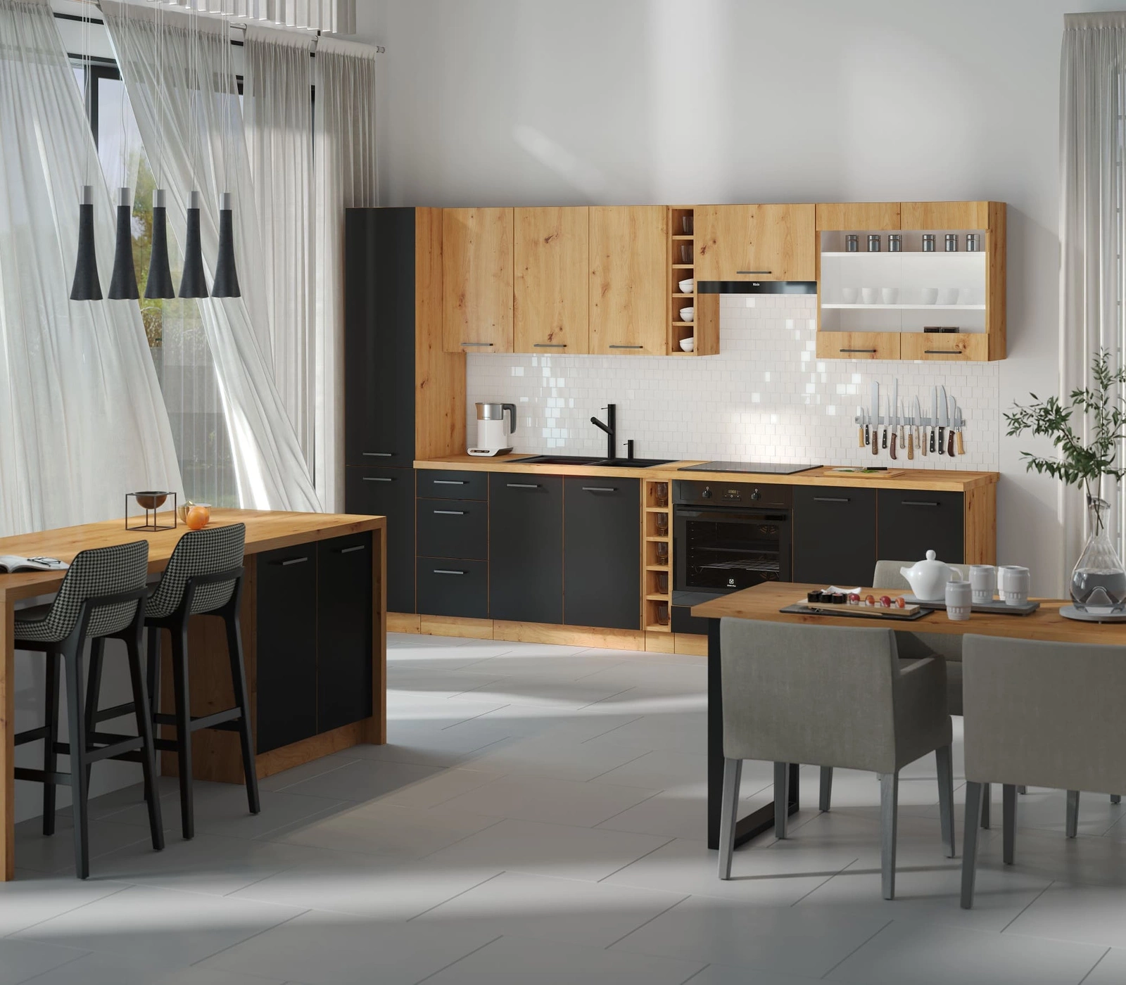 Díky svému univerzálnímu umístění se kuchyňský nábytek hodí do interiéru každé kuchyně. Kontrastní kombinace řemeslného dubu z černá dodává kuchyňskému nábytku eleganci a jedinečný styl. Černá rukojeti podtrhnout eleganci kuchyňských skříněk.