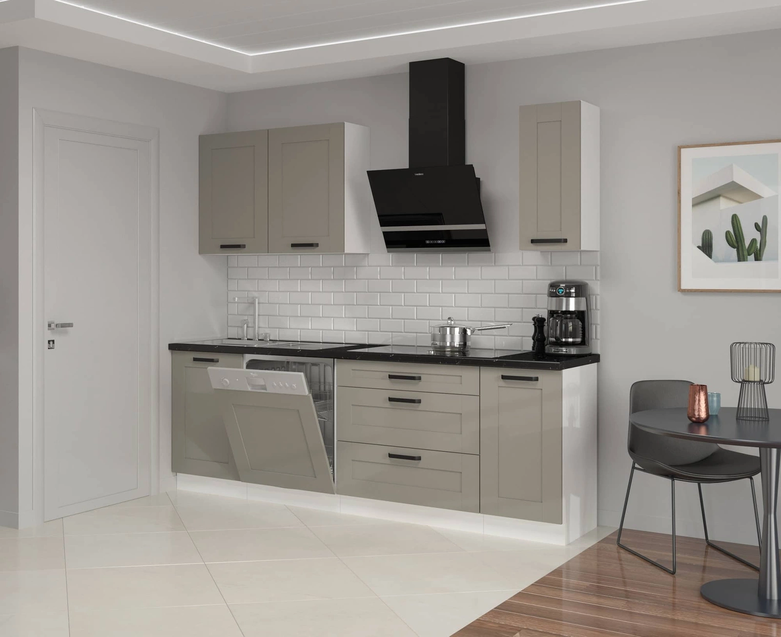 Díky svému univerzálnímu umístění se kuchyňský nábytek hodí do interiéru každé kuchyně. Fronty v šedobéžové a bílé barvě těla, ozvláštnění kuchyňského nábytku. Black metal rukojeti podtrhnout eleganci kuchyňských skříněk.
