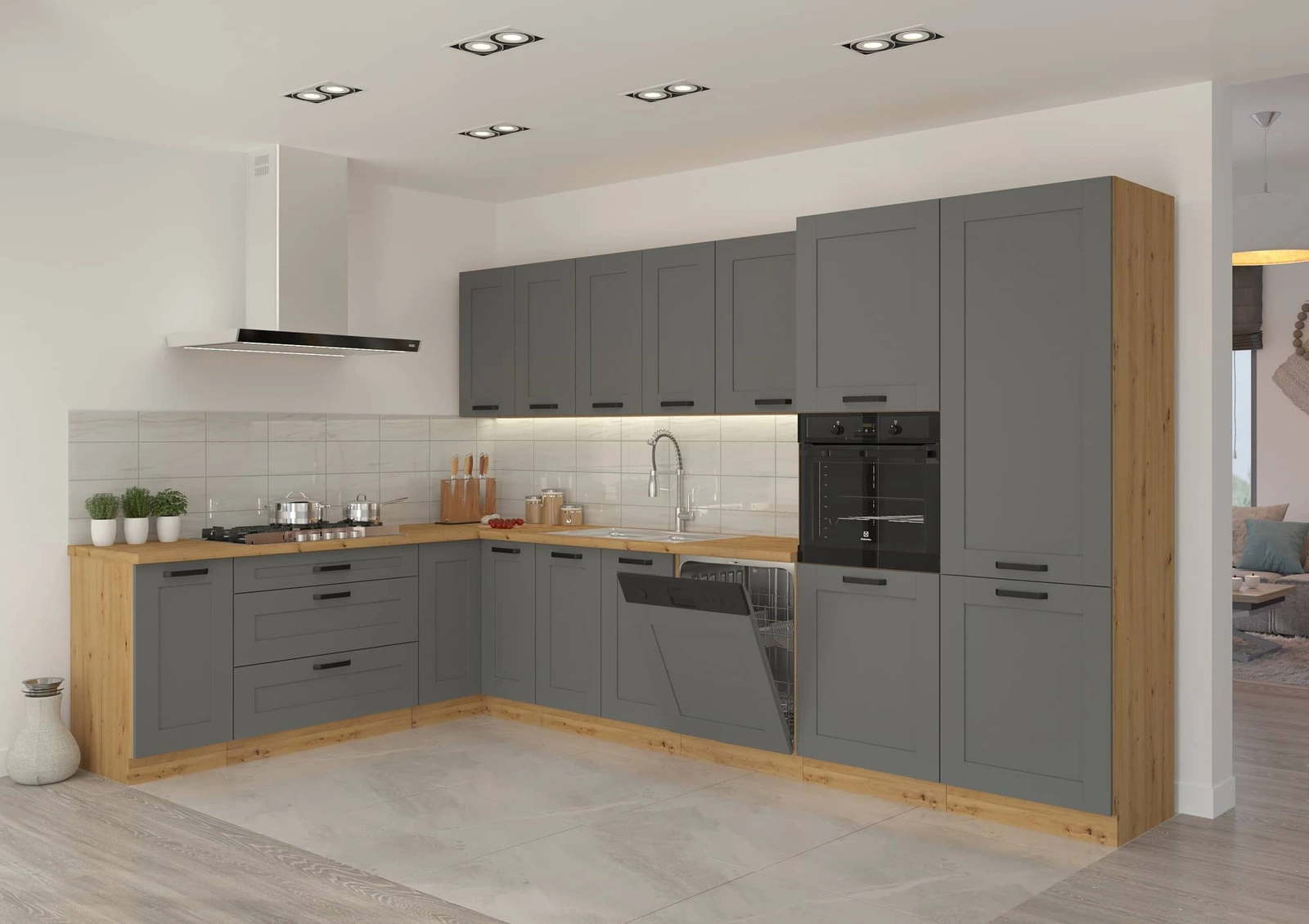 Sestava kuchyňského nábytku Asti v šedém jasanu / dubu artisan je návrh hotové sestavy kuchyňského nábytku, která se skvěle hodí do klasických i moderních interiérů.