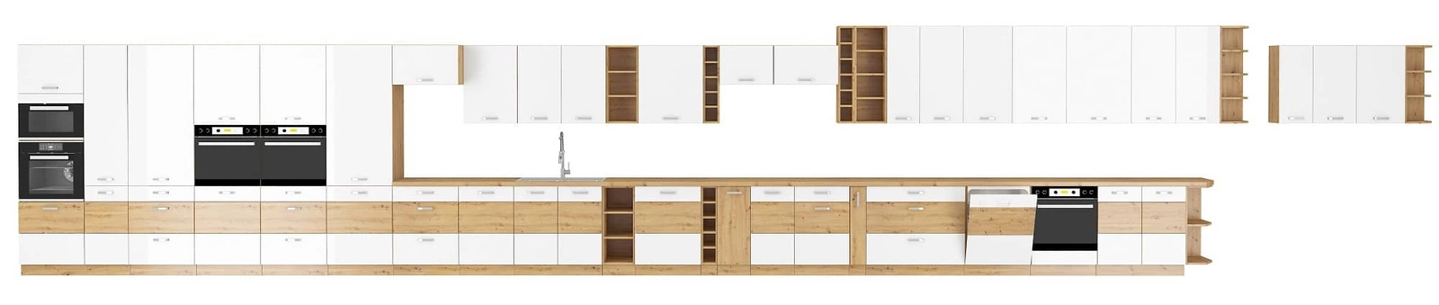 Čelní stěny kuchyňských linek v bílá jsou vyrobeny z mDF a přikryté fólií v lesklé. Výrazný kontrast k čelům kuchyňských skříněk vytvářejí vložky v barvách dub artisan. Hrany čel kuchyňských skříněk jsou chráněny dýhou, která má dvě funkce. Je to zabezpečení proti vlhkosti a chrání proti náhodnému poškození.