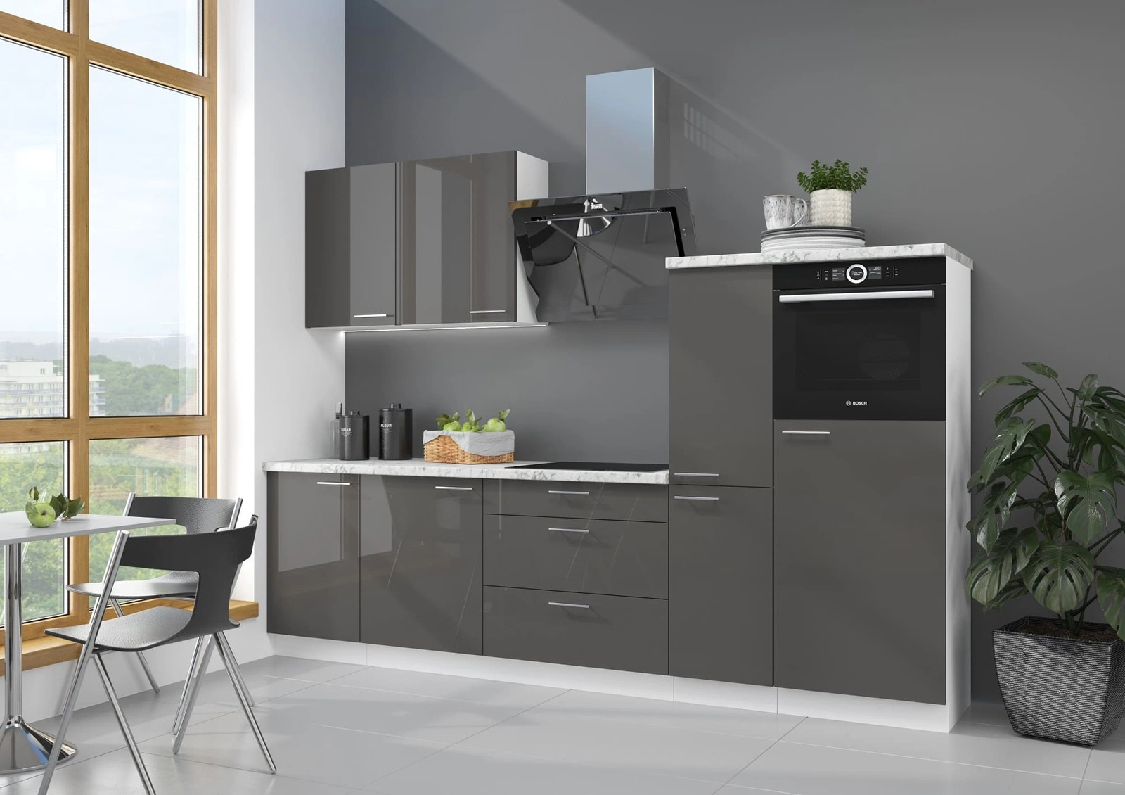 Díky svému univerzálnímu umístění se kuchyňský nábytek hodí do interiéru každé kuchyně. Kombinace front v šedá lesk s bílá korpusy dodávají kuchyňskému nábytku stylovou kombinaci. Chromované kovové rukojeti jsou skvělou ozdobou nábytku a podtrhují eleganci kuchyňských skříněk.