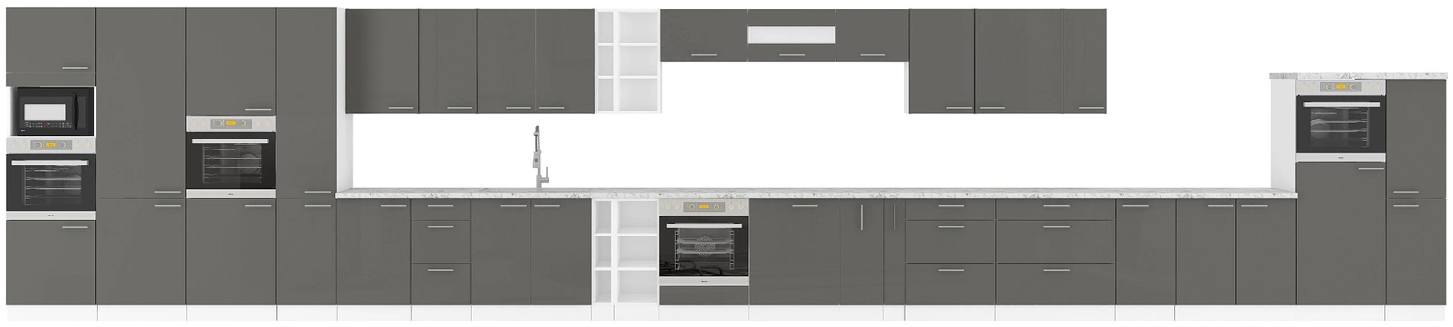 Díky svému univerzálnímu umístění se kuchyňský nábytek hodí do interiéru každé kuchyně. Kombinace front v šedá lesk s bílá korpusy dodávají kuchyňskému nábytku stylovou kombinaci. Chromované kovové rukojeti jsou skvělou ozdobou nábytku a podtrhují eleganci kuchyňských skříněk.