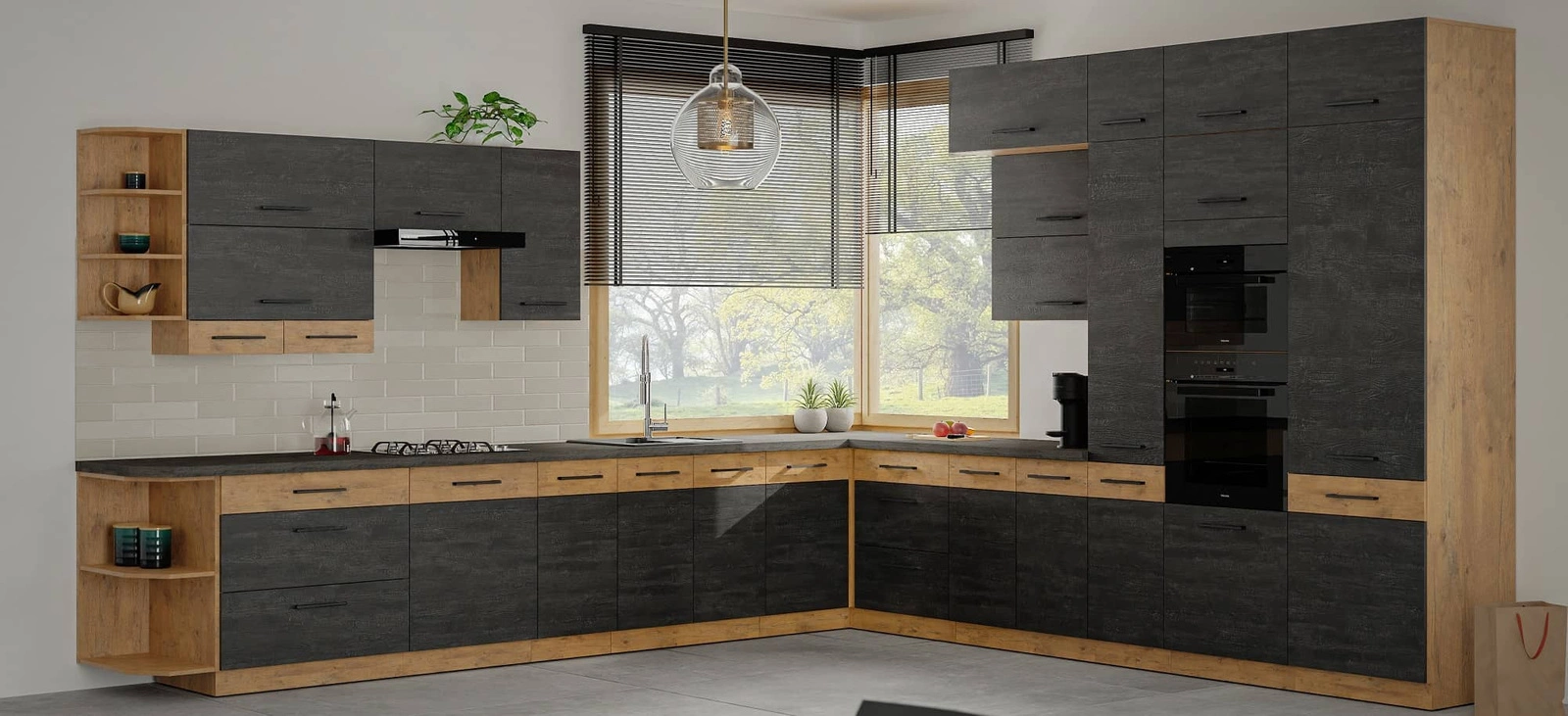 Systém systém tichého zavírání zvyšuje komfort i zabezpečení použití nábytku. Stylovým doplňkem čel kuchyňských skříněk jsou černé úchytky, které kromě své hlavní funkce dodávají nábytku zvláštní charakter.