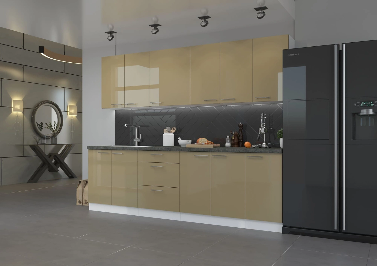 Díky svému univerzálnímu umístění se kuchyňský nábytek hodí do interiéru každé kuchyně. Kombinace front v béžová lesklý s bílé korpusy dodávají kuchyňskému nábytku stylovou kombinaci. Chromované kovové rukojeti jsou skvělou ozdobou nábytku a podtrhují eleganci kuchyňských skříněk.