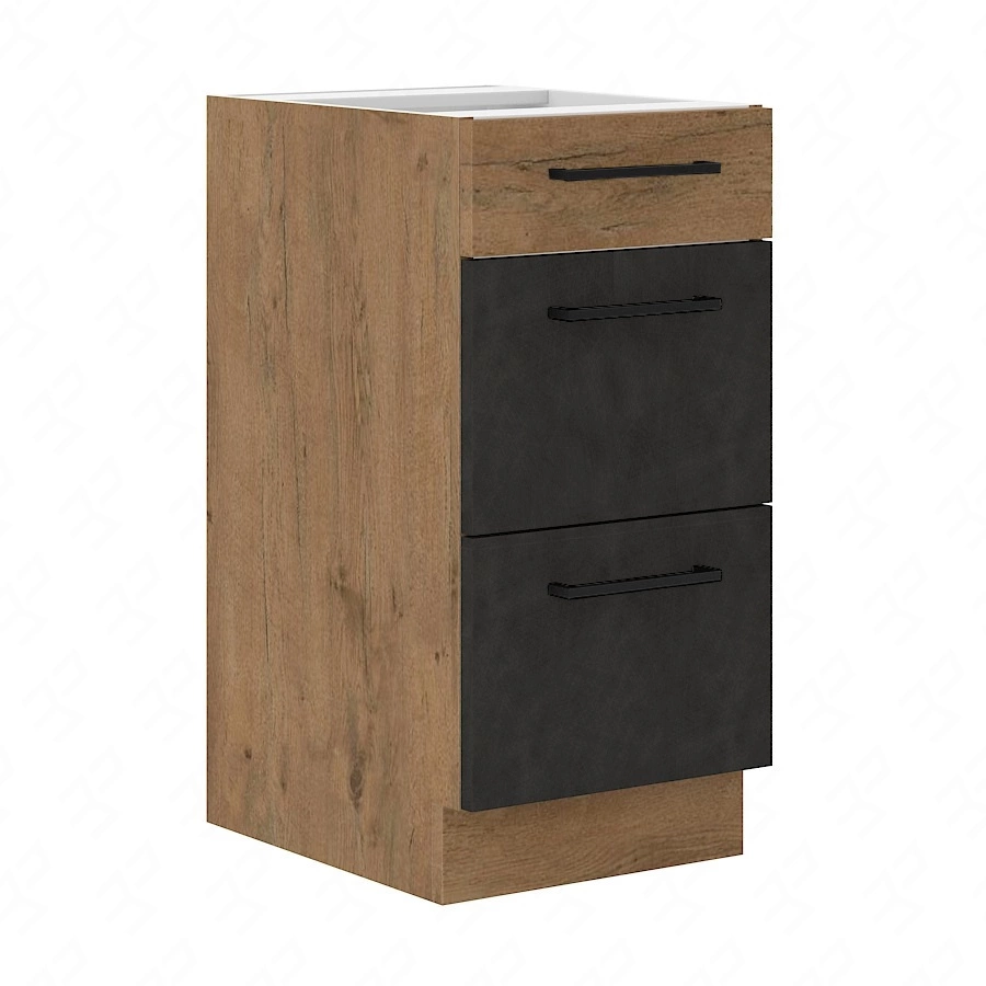 Skrzynia kuchyňská stojící se zásuvkami Valico 40 D-3S-BB je funkční a stylový prvek vybavení kuchyně, který spojuje moderní design s praktickými řešeními. Vyrobena z materiálů nejvyšší kvality, je odolná vůči páře, vysokým teplotám a rozlitým tekutinám, co z ní činí mimořádně trvanlivý a snadno udržovatelný nábytek. Skříň je vybavena třemi prostornými zásuvkami, které poskytují dostatek prostoru pro uskladnění různých kuchyňských doplňků, což umožňuje udržení pořádku a organizace. Tmavé přední panely v kombinaci s dřevěnými bočnicemi dodávají skříni elegantní vzhled, který se skvěle hodí k různým kuchyňským stylům.