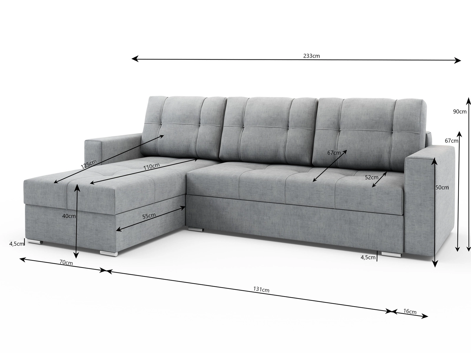 Rozměry nábytku jsou optimální. Šířka rohu 233 cm, maximální výška 90 cm a hloubka 140 cm. Spací plocha rohové jednotky je 130x200 cm. Výška sedadla nábytku je 40 cm a maximální výška opěradla je 50 cm. Vlnité pružiny a polyuretanová pěna T30 je materiál, z něhož je vyrobeno sedadlo rohu. Zádová opěrka polštáře zaručuje pohodlný odpočinek po dlouhém dni, který oceníte vy, vaši blízcí i hosté, kteří si na tuto výjimečnou rohovou sedačku sednou!