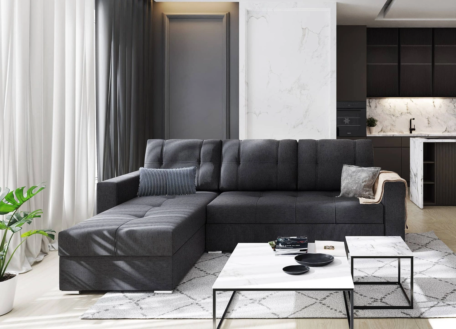 Rohová jednotka s funkcí spánku složenou z kostkovaný Lars 99 zaručuje nejvyšší komfort a funkčnost při každodenní relaxaci v obývacím pokoji, pokoji pro hosty nebo v jakékoli jiné místnosti, kam plánujete umístit tuto mimořádně moderní rohovou pohovku! Tkanina se vyznačuje vysoká odolnost proti roztřepení a roztažení, a je také snadno se udržuje v čistotě. Další výhodou tkaniny Lars je mírně melanžová vazba, která dodává rohu jedinečnou krásu. Díky vysoké odolnosti proti oděru bude roh Aldo dlouho vypadat skvěle. Rohová jednotka je vyrobena z vysoce kvalitních materiálů, které jsou odolné vůči vnějším vlivům, jako je čalounění nábytku a různé druhy nárazů.