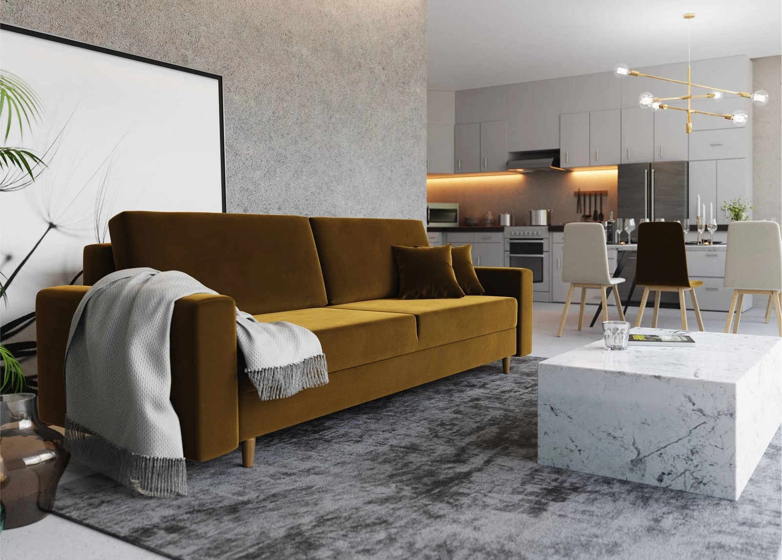 Pohovka Mustard Ines s funkcí spaní v tradičním a skandinávském stylu dokonale zapadne do každého interiéru a dodá mu jemnost a charakter
