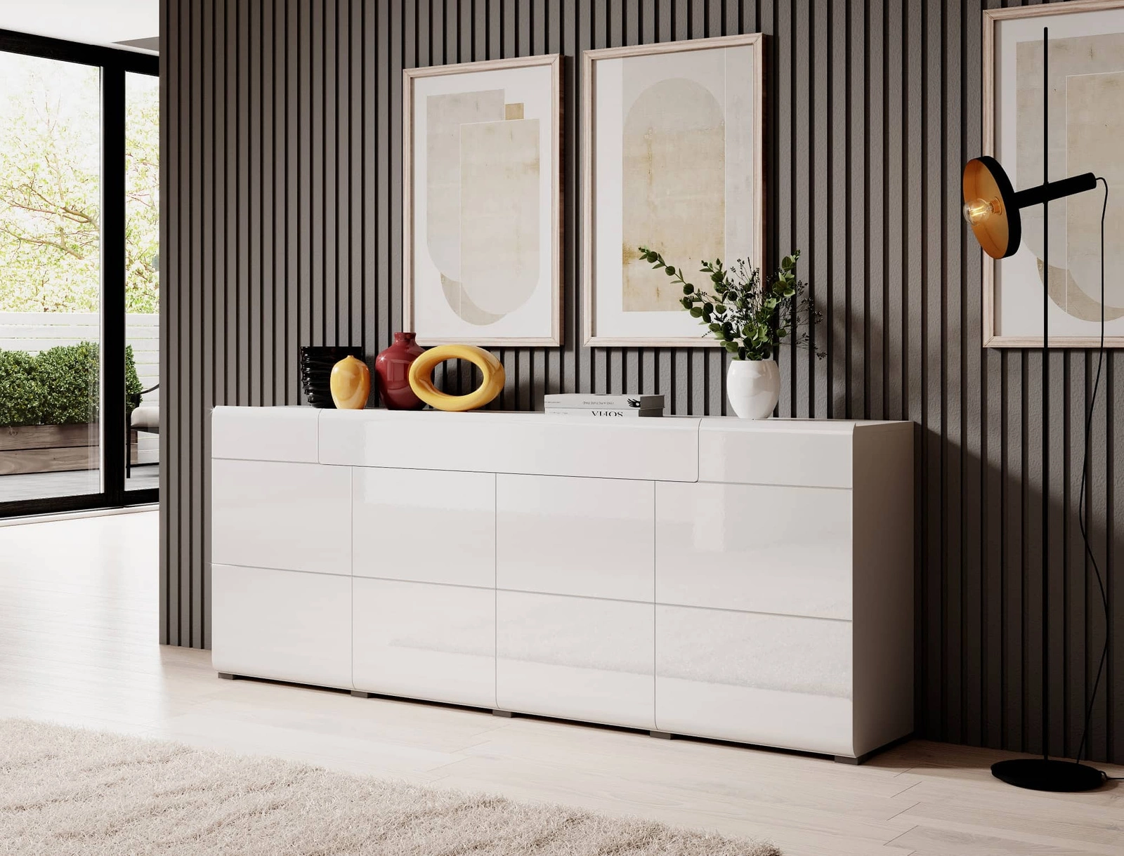 Komoda s šuplíkem Toledo o délce 208 cm v bílém lesklém provedení je elegantní a moderní kus nábytku, který přinese lesk do každého interiéru. Vyznačuje se jednoduchými, ale zároveň stylovými liniemi a jemně zaoblenými předními částmi, které jí dodávají subtilní a luxusní vzhled. Komoda má prostorné šuplíky a skřínky, nabízející dostatek místa k uložení různých věcí, což z ní činí ideální volbu jak do obývacího pokoje, ložnice, tak i předsíně. Její minimalistický design z ní činí nejen praktický, ale také efektní dekorativní prvek.