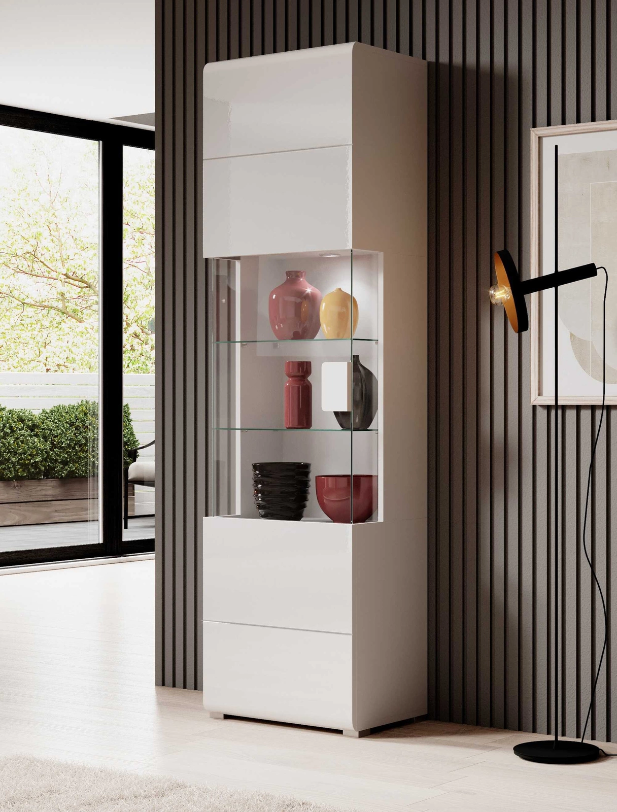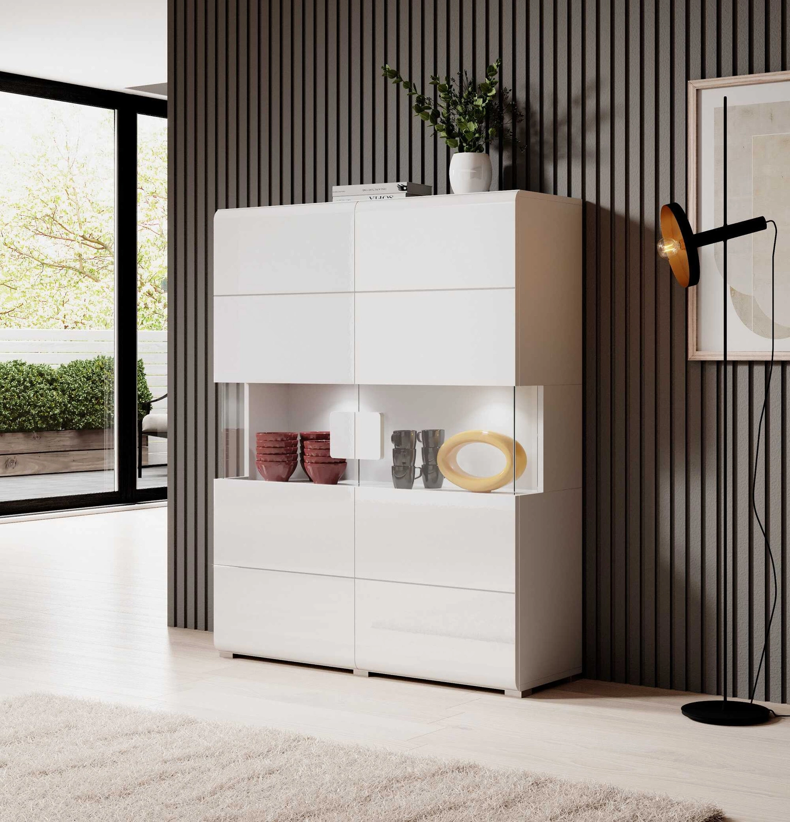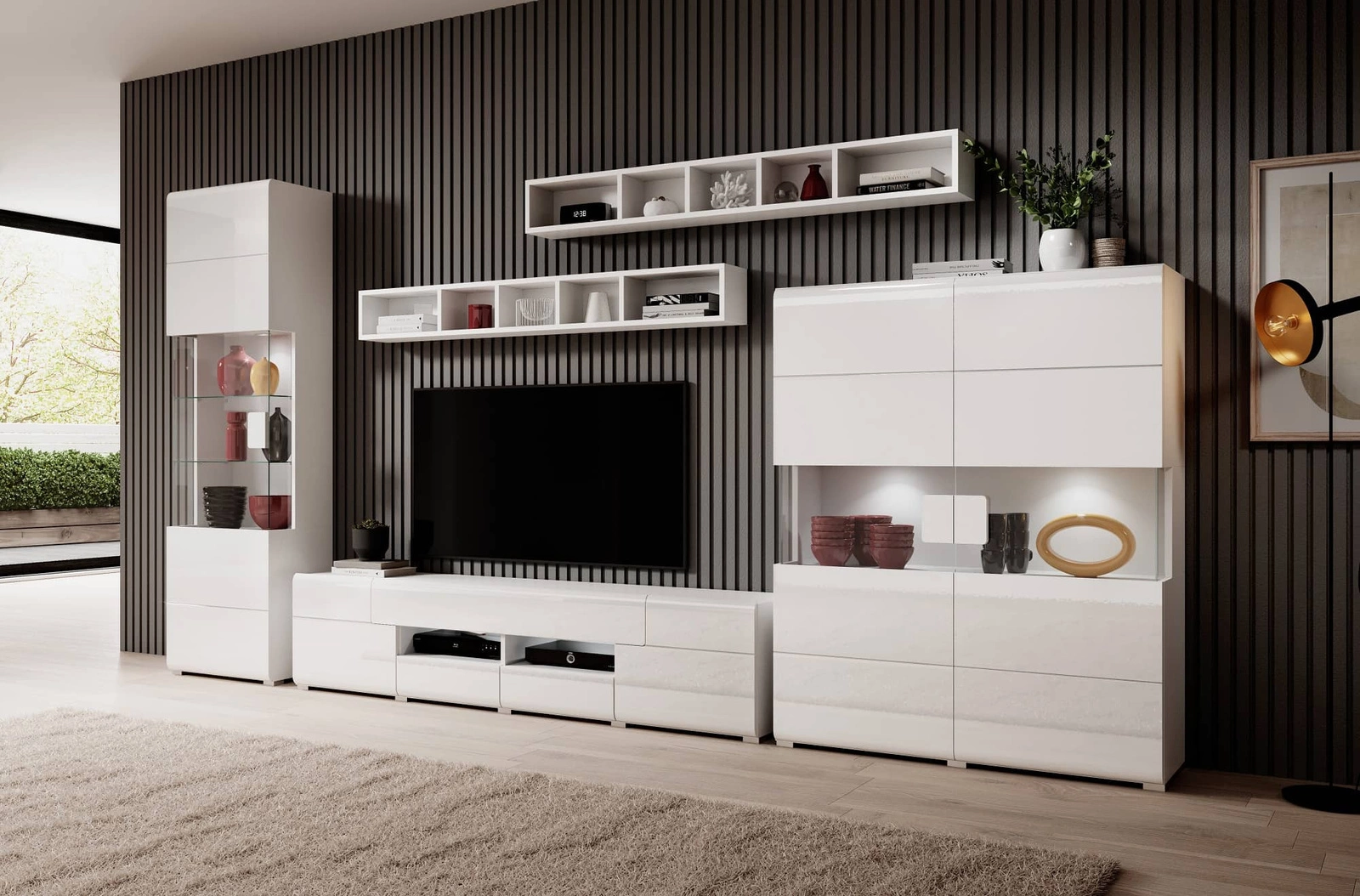Nástěnná skříňka Toledo bílá / bílý lesk je ideální do obývacího pokoje a dodá vašemu interiéru jedinečný charakter