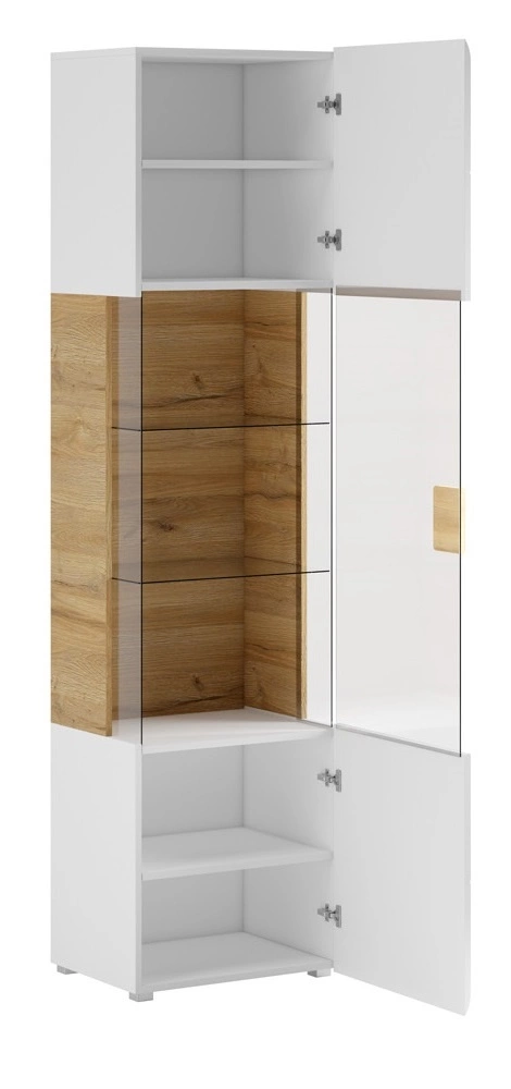 Korpus nábytku je vyroben z vysoce kvalitní laminované desky, která je vysoce odolná vůči vnějším vlivům. Přední strany z mDF desky pokryté membránovou fólií. Prosklená čela a boky vitrín umožňují vystavit stylové doplňky. Prohlubně uprostřed skříně RTV je ideálním místem pro vaše zařízení rtv nebo herní konzole. Standardní vybavení skříně RTV Toledo zahrnuje výsuvy zásuvek se systémem plného výsuvu.