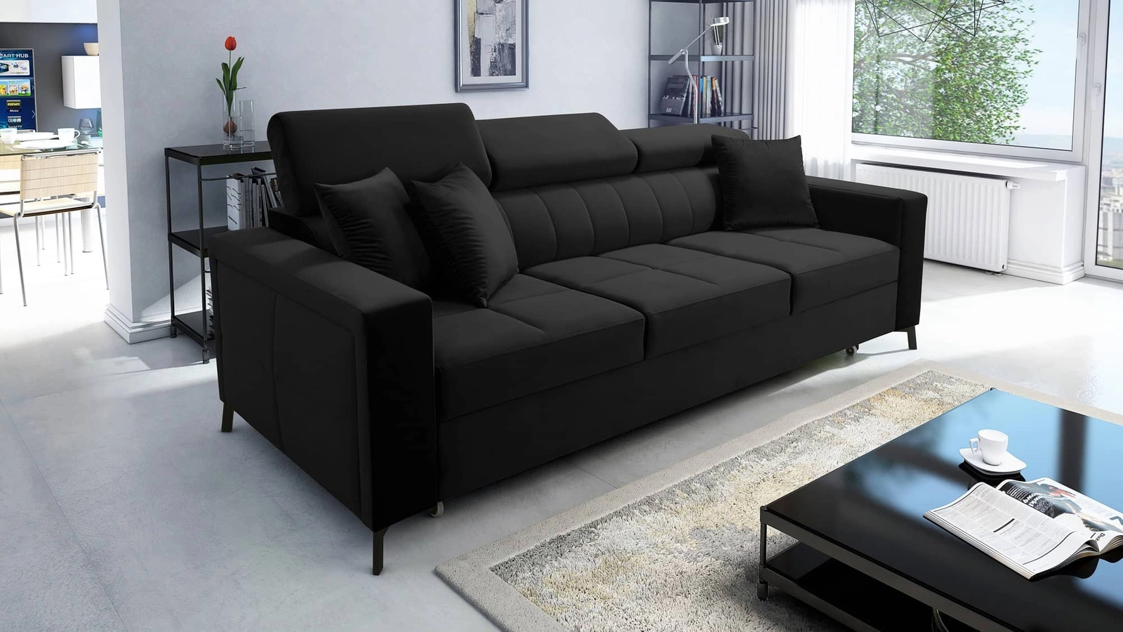Pohovka Nausa v černé barvě je moderní řešení, které se skvěle hodí do každého obývacího pokoje, pokoje pro hosty nebo kanceláře. Její jednoduchý, elegantní tvar a univerzální barevnost ji činí snadno kombinovatelnou s různými interiéry. Pohovka byla navržena s ohledem na pohodlí uživatele, nabízí nastavitelná opěrky hlavy, které zajišťují komfort při odpočinku, a funkci spaní, což z ní činí praktické řešení pro ty, kteří hledají multifunkční nábytek. Dále je materiál, ze kterého je pohovka vyrobena, odolný proti zatržení a poškrábání, což zaručuje její trvanlivost a snadnou údržbu.