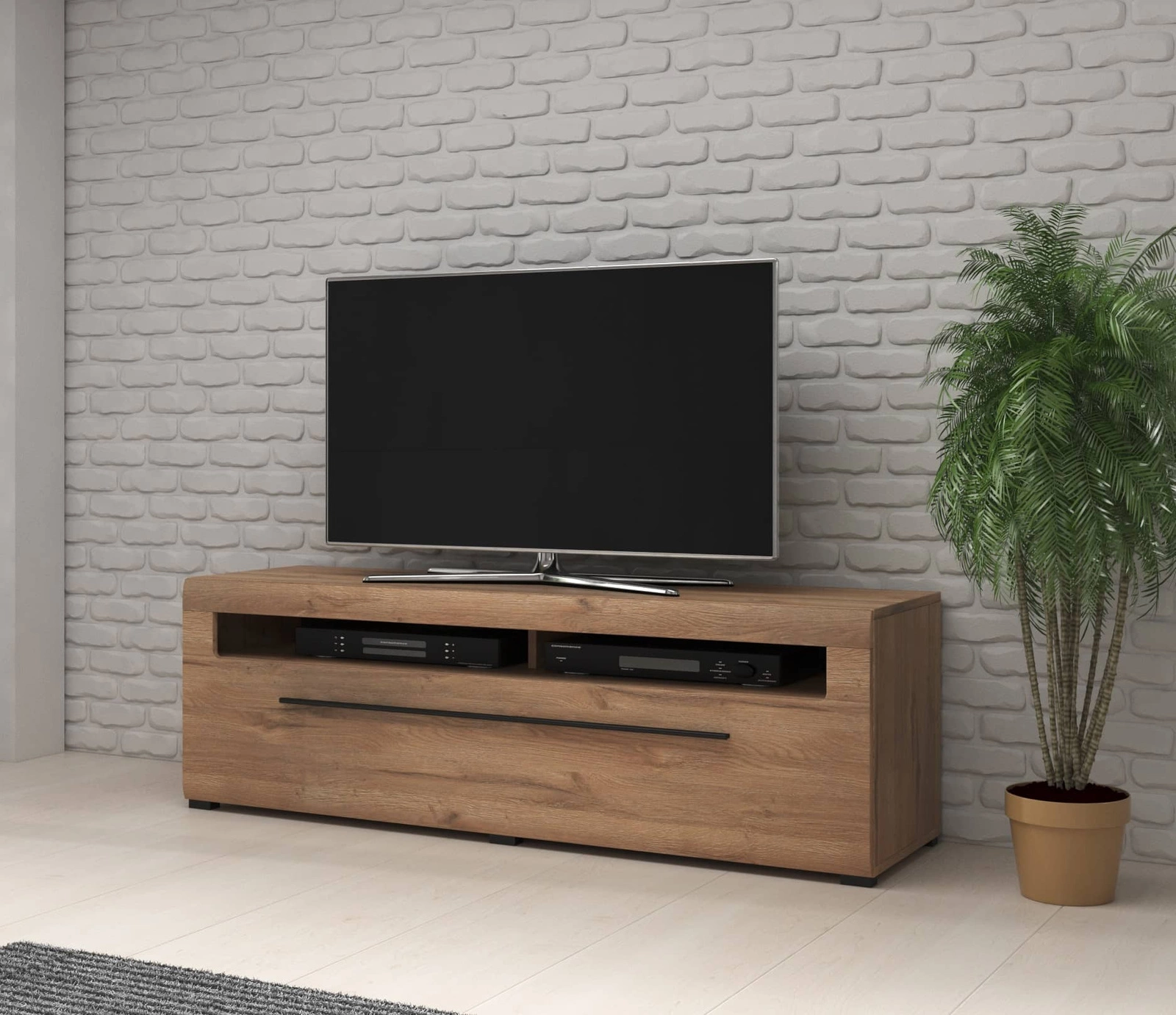 Komoda RTV Tulsa z szufladą to nowoczesne, a zarazem praktyczne rozwiązanie do salonu. Meble Tulsa sprawdzą się we wnętrzu urządzonym w stylu nowoczesnym, klasycznym, a także skandynawskim. Komoda stanie się stylowym wykończeniem pomieszczenia oraz nada mu szczególnego charakteru. Komoda RTV Tulsa jest atrakcyjna pod względem wizualnym oraz funkcjonalnym. Długi uchwyt w kolorze czarnym wysmukla komodę oraz jest kontrastowym elementem, który przyciąga wzrok. Komoda jest dostępna w dwóch kolorach, białym oraz dąb grandson.