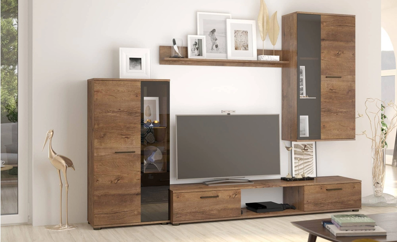 • Meblościanka Senja posiada nowoczesny design. Obrzeża meblościanki wykończone zostały wysokiej jakości okleiną PVC. Półki wykonane z bezpiecznego szkła hartowanego. Witryny meblościanki mogą być stojące lub wiszące. Szafka RTV zamykana klapami.