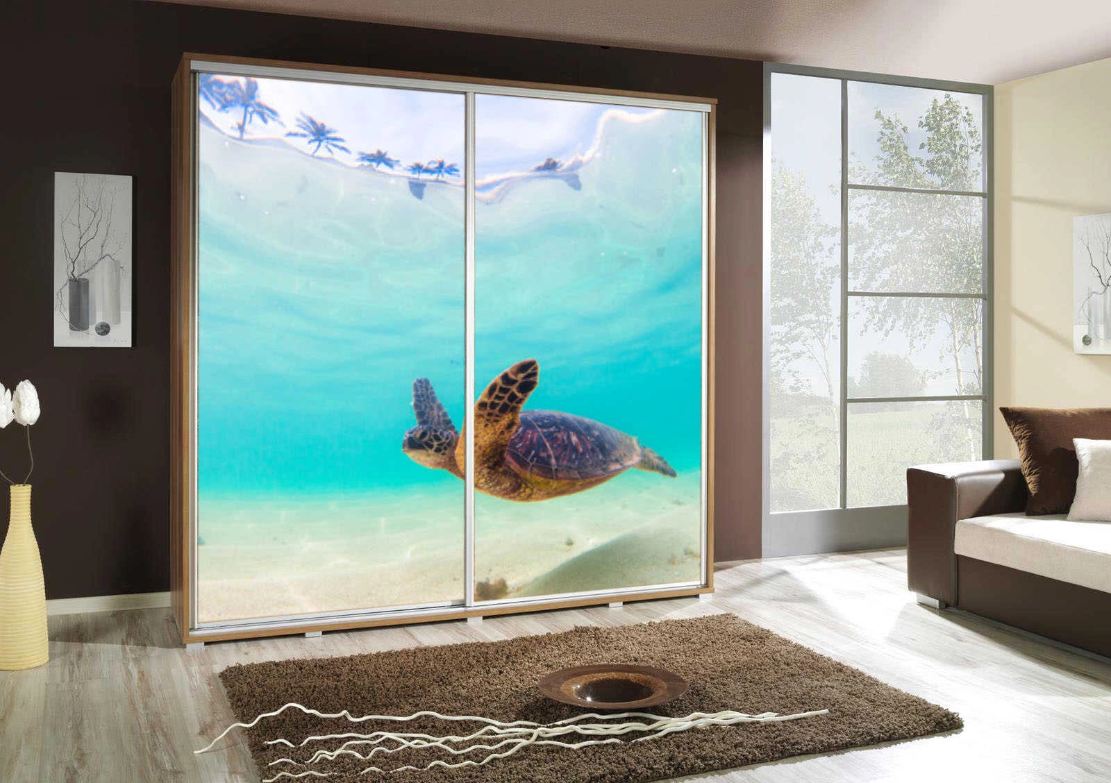 Posuvná skříň Artistino s grafikou želvy v dubu catania je receptem na moderní a funkční interiér dětského pokoje.