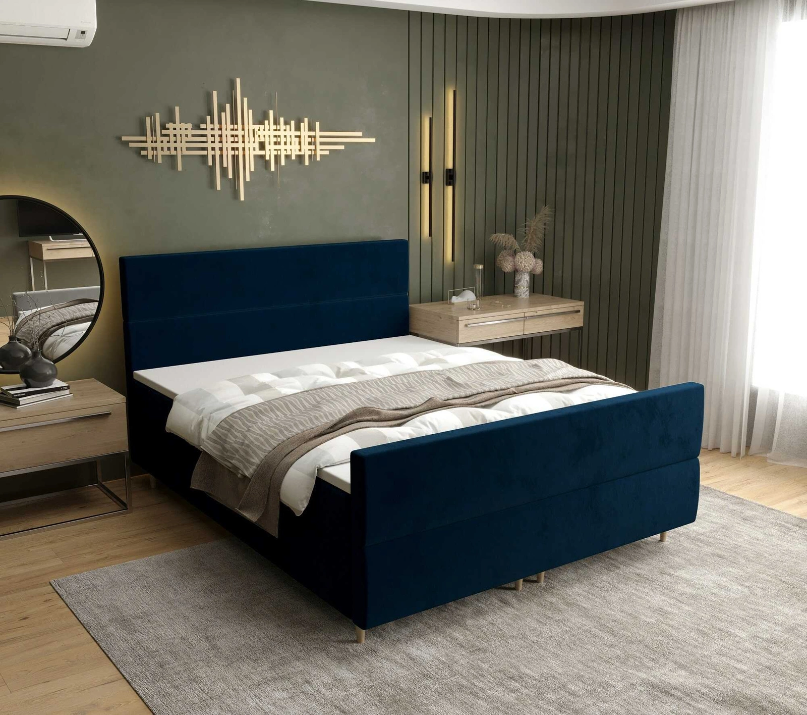 Modrá kontinentální postel Benet 160x200 v moderním skandinávském stylu s výrazným čelem a nohou