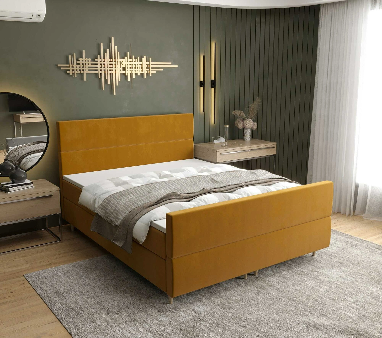 Kontinentální postel Benet 160x200 v hořčicové barvě je stylový kus nábytku, který se skvěle hodí do každé ložnice.
