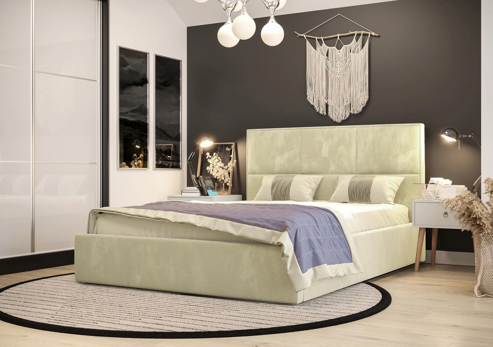 Lůžko z tkaniny typ samet Monolit 02 zaručuje maximální pohodlí a funkčnost pro každodenní relaxaci v ložnici. Tkanina je opatřena vrstvou hydrofobní, což zaručuje omezenou absorpci kapalin. Zajímavá struktura tkaniny dodává jedinečný charakter. Díky všem vlastnostem použité tkaniny si postel zachová svůj původní vzhled po dlouhou dobu. Konstrukce lůžka zajišťuje velkou stabilitu a pohodlí při používání. Rám postele je vyroben ze dřeva a nábytkové desky. Pohodlná a praktická opěrka hlavy je zakončen šesti obdélníkovými panely.