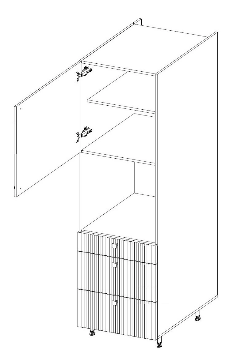 Vnitřek kuchyňské linky je rozdělen na dvě části. Horní část je vybavena policemi s tříúrovňovým nastavením výšky. To vám umožní získat prostor pro vysoké předměty. Spodní část tvoří 3 zásuvky vyrobené technologií Premium Box. Zásuvky Premium Box se vyznačují zvýšenou odolností, díky které lze skříňku až po okraj naplnit kuchyňským náčiním a doplňky. Dvířka kuchyňské linky jsou univerzální a lze je namontovat na pravou nebo levou stranu. Standardní výbavou jsou panty a zásuvky se systémem tichého dovírání. Zpomalovače zvyšují komfort a bezpečnost používání nábytku.