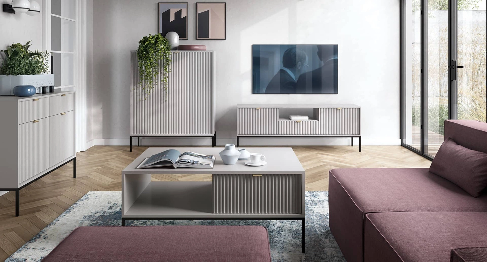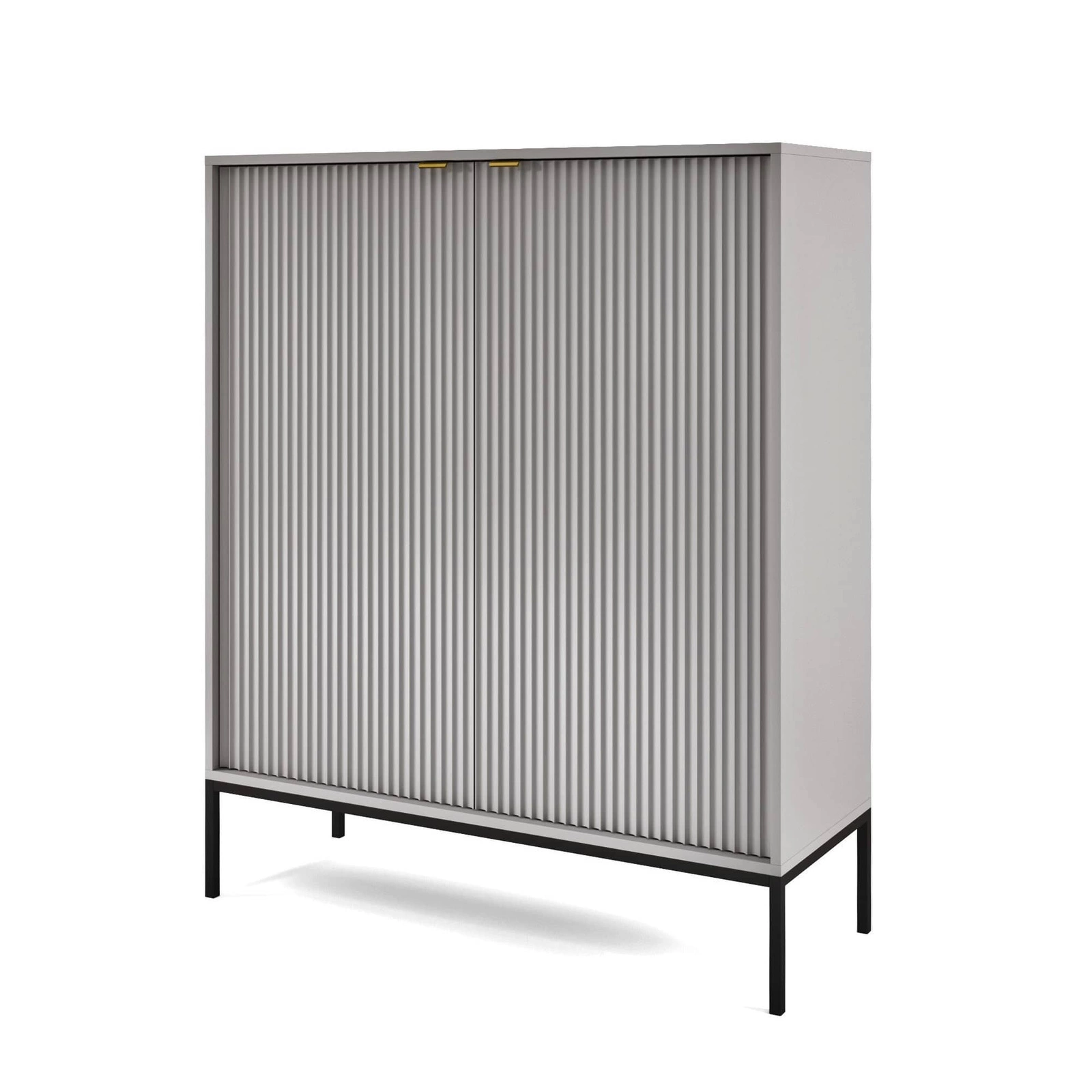 Komoda Lovro 104 cm v šedé barvě je stylový kus nábytku, který se skvěle hodí do každého obývacího pokoje nebo jídelny.