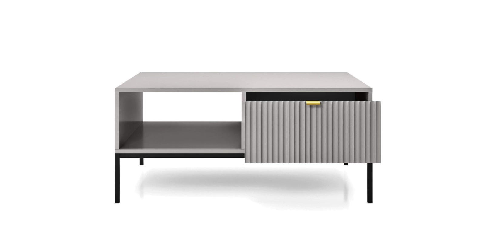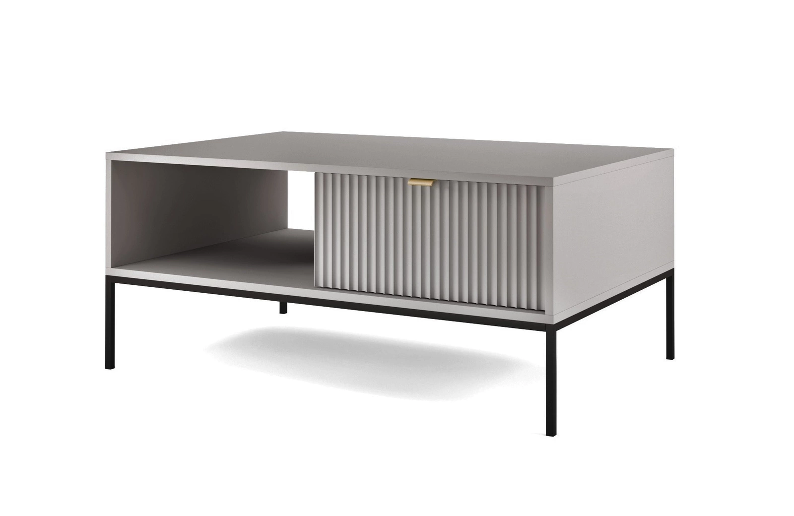 Rýhované fkování zásuvek z MDF s tloušťkou 18 mm dodává zvláštní kouzlo. Stylovou tečkou na čelních stranách jsou úchyty na okrajích ve zlaté barvě. Struktura nábytku se měnila pomocí černé kovové nohy výška 20 cm.