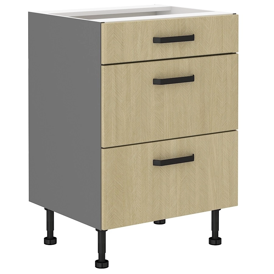Kuchyňská skříňka Chevron se zásuvkami 60 cm v barvě rybí kost béžová / antracitová patří do kategorie modulárního kuchyňského nábytku, ze kterého lze vytvořit libovolnou sestavu.