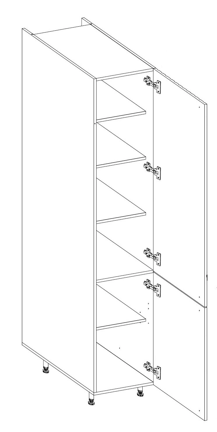 Vysoká kuchyňská skříňka se dodává po částech, které jsou zabaleny v pětivrstvé lepenkové krabici. Veškeré kování potřebné k montáži, tj. šrouby, vruty, hmoždinky, panty, úchytky, zátky, je přibaleno společně s komponenty kuchyňské skříňky.