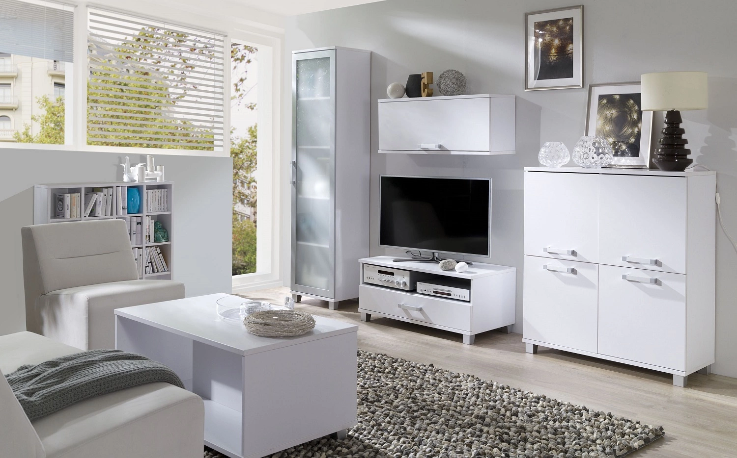 Široká vitrína Maximus v bílé barvě je návrh pro obývací pokoj, jídelnu a kancelář, který potěší milovníky klasických interiérů.