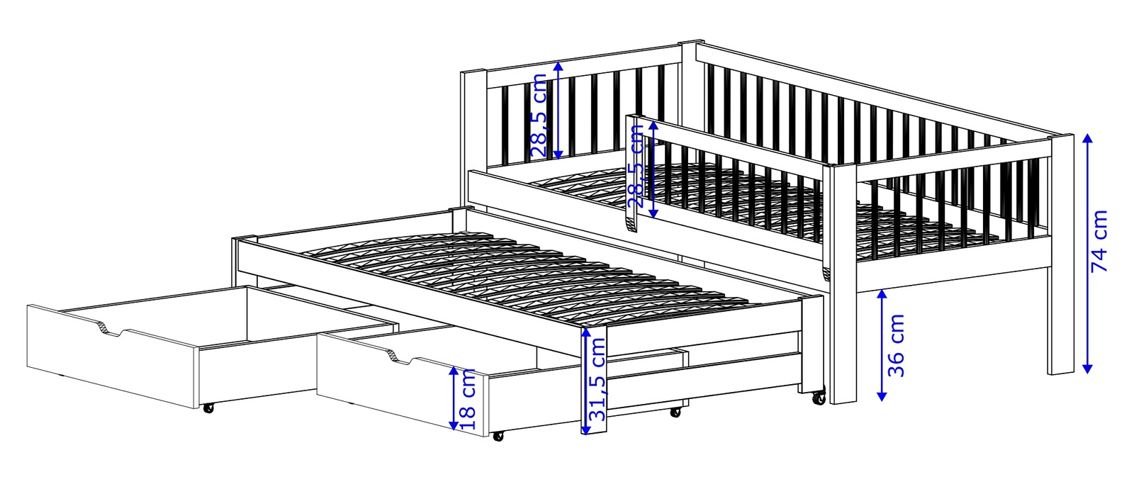Dřevěná postel Simba je ideální volbou pro dětský pokoj. Solid design postel poskytuje pohodlí a bezpečí při spánku a hraní. Postel Simba je vyrobena z masivního borovicového dřeva lakovanýkterý se vyznačuje velkým robustní a odolné vůči vnějším faktorům. Výsuvné lůžko pro děti je vybaven dvěma kolečky, která usnadňují jeho vytahování. Osvědčený systém upevnění pomocí dřevěných hmoždinek a pevných šroubů zajišťuje vysokou stabilitu celé konstrukce.