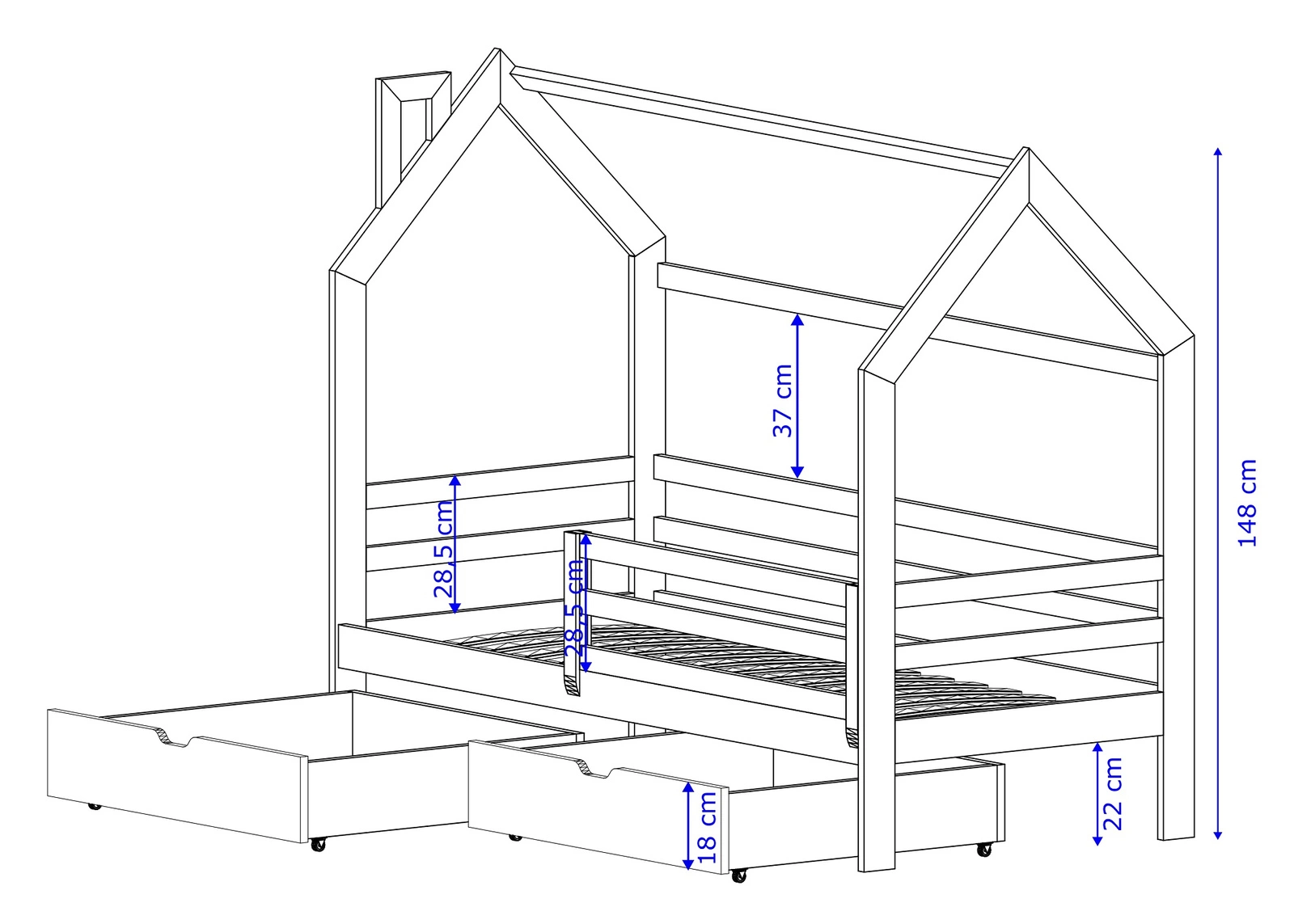 Pro větší funkčnost jsou dětské postele v domku vybaveny prostornými zásuvky, pro pohodlné uložení nezbytného příslušenství.