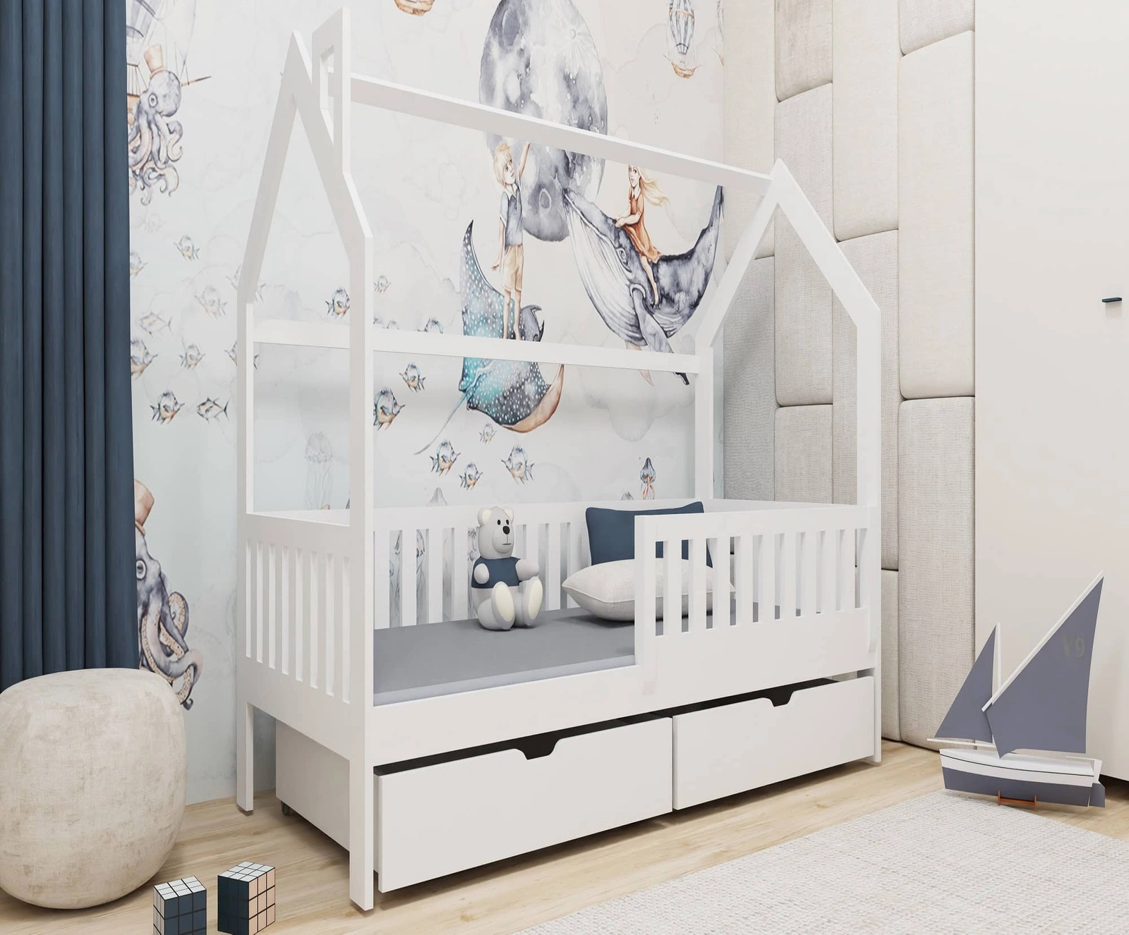 Dřevěná postel Timon 70x160 cm bílá moderní design dětský domeček postel z masivního borovicového dřeva prostorné zásuvky