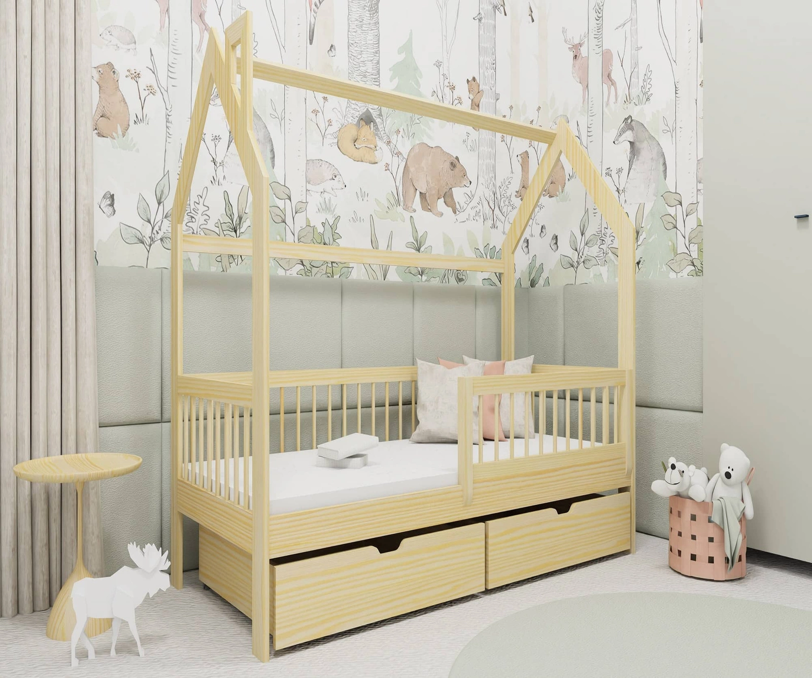 Dřevěná postel Pumba 70x140 cm borovice dětská postel z masivního borovicového dřeva dětský postelový domeček s prostornými zásuvkami