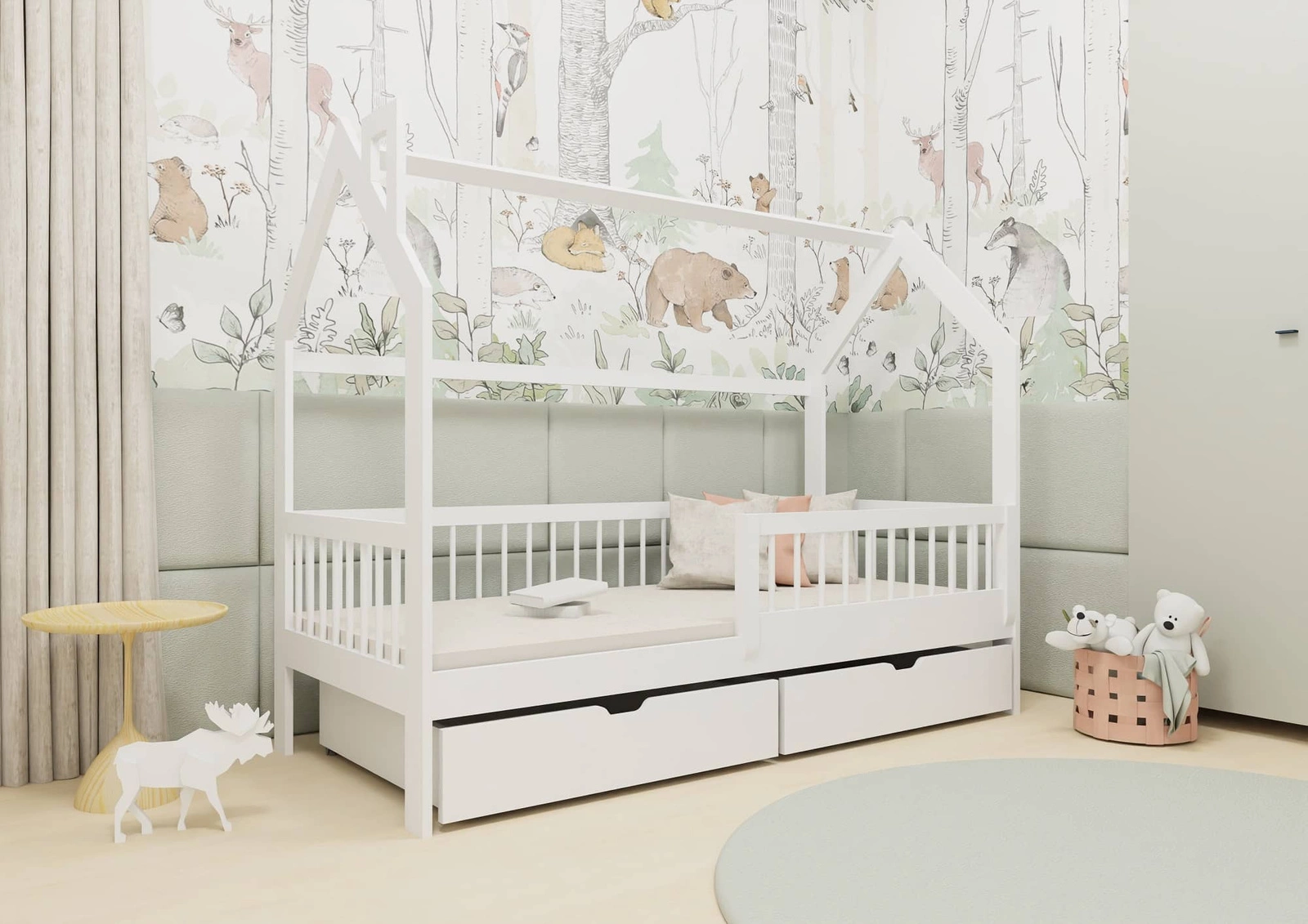 Dřevěná postel Pumba 90x190 cm bílá dětská postel z masivního borovicového dřeva dětský domeček postel s prostornými zásuvkami