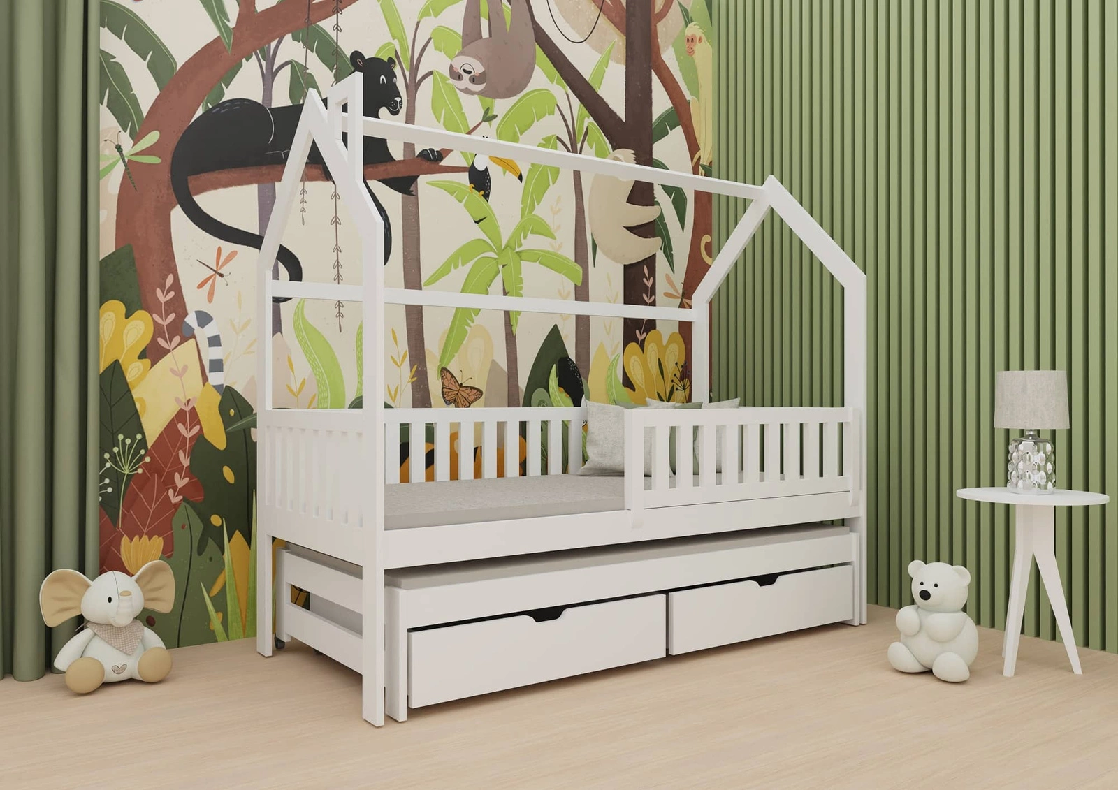 Patrové postele v domě je ideální volbou pro dětský pokoj. Solid design postel poskytuje pohodlí a bezpečí při spánku a hraní. Dětská postel Miki je vyrobena z masivního borovicového dřeva malované bílá, která se vyznačuje velkým robustní a odolné vůči vnějším faktorům. Výsuvné lůžko pro děti je vybaven dvěma kolečky, která usnadňují jeho vytahování. Osvědčený systém upevnění pomocí dřevěných hmoždinek a pevných šroubů zajišťuje vysokou stabilitu celé konstrukce.