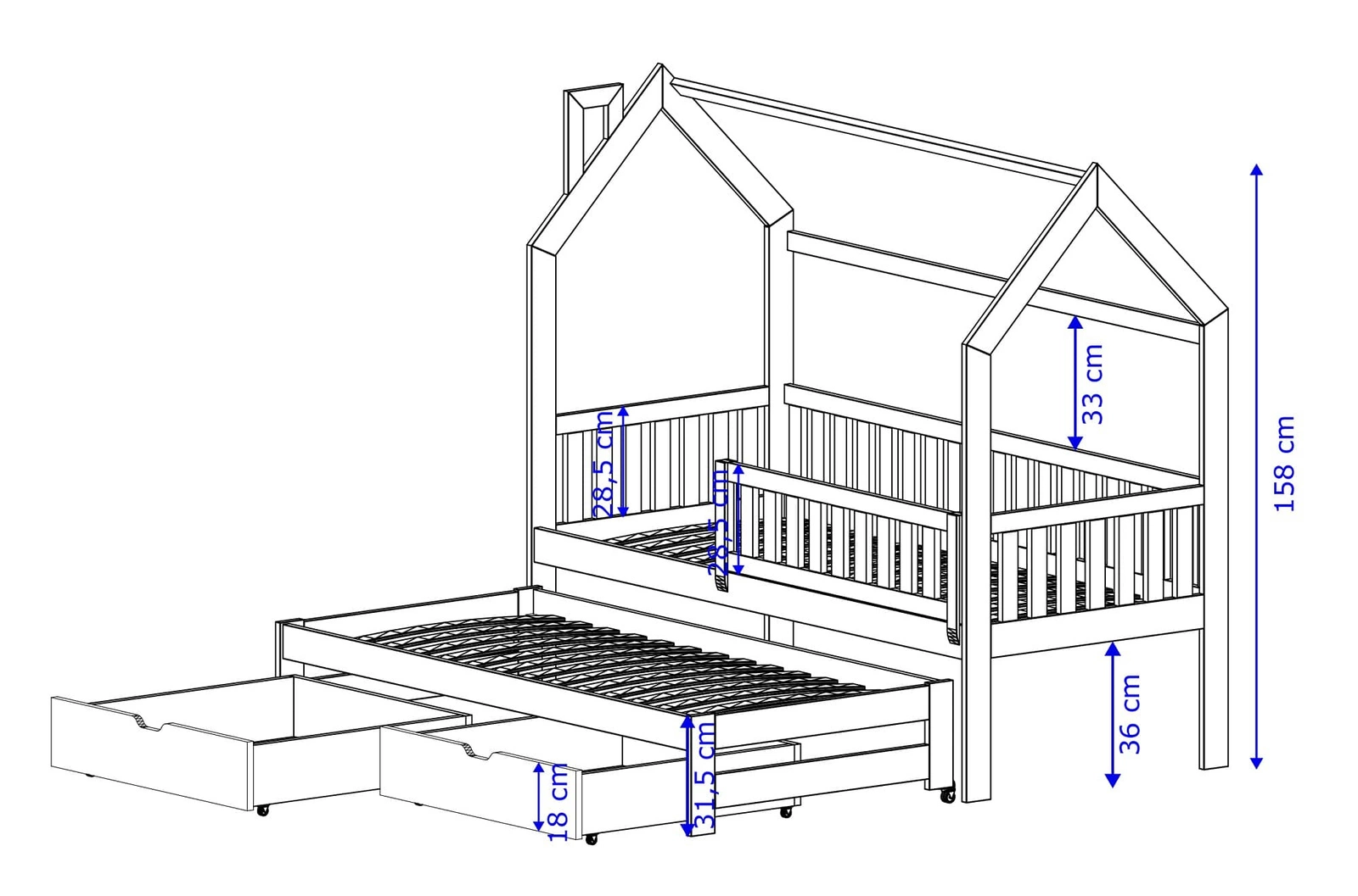 Pro větší funkčnost jsou dětské postele v domku vybaveny prostornými zásuvky, pro pohodlné uložení nezbytného příslušenství.
