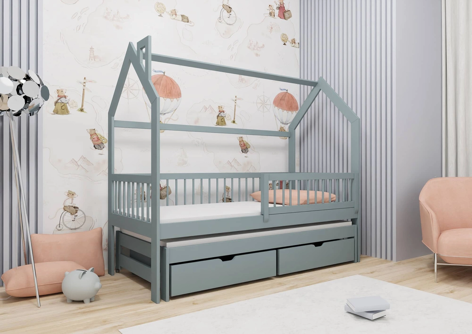 Patrové postele v domě je ideální volbou pro dětský pokoj. Solid design postel poskytuje pohodlí a bezpečí při spánku a hraní. Dětské postele Dyzio jsou vyrobeny z masivního borovicového dřeva malované šedá, která se vyznačuje velkým robustní a odolné vůči vnějším faktorům. Výsuvné lůžko je vybaven dvěma kolečky, která usnadňují jeho vytahování. Osvědčený systém upevnění pomocí dřevěných hmoždinek a pevných šroubů zajišťuje vysokou stabilitu celé konstrukce.