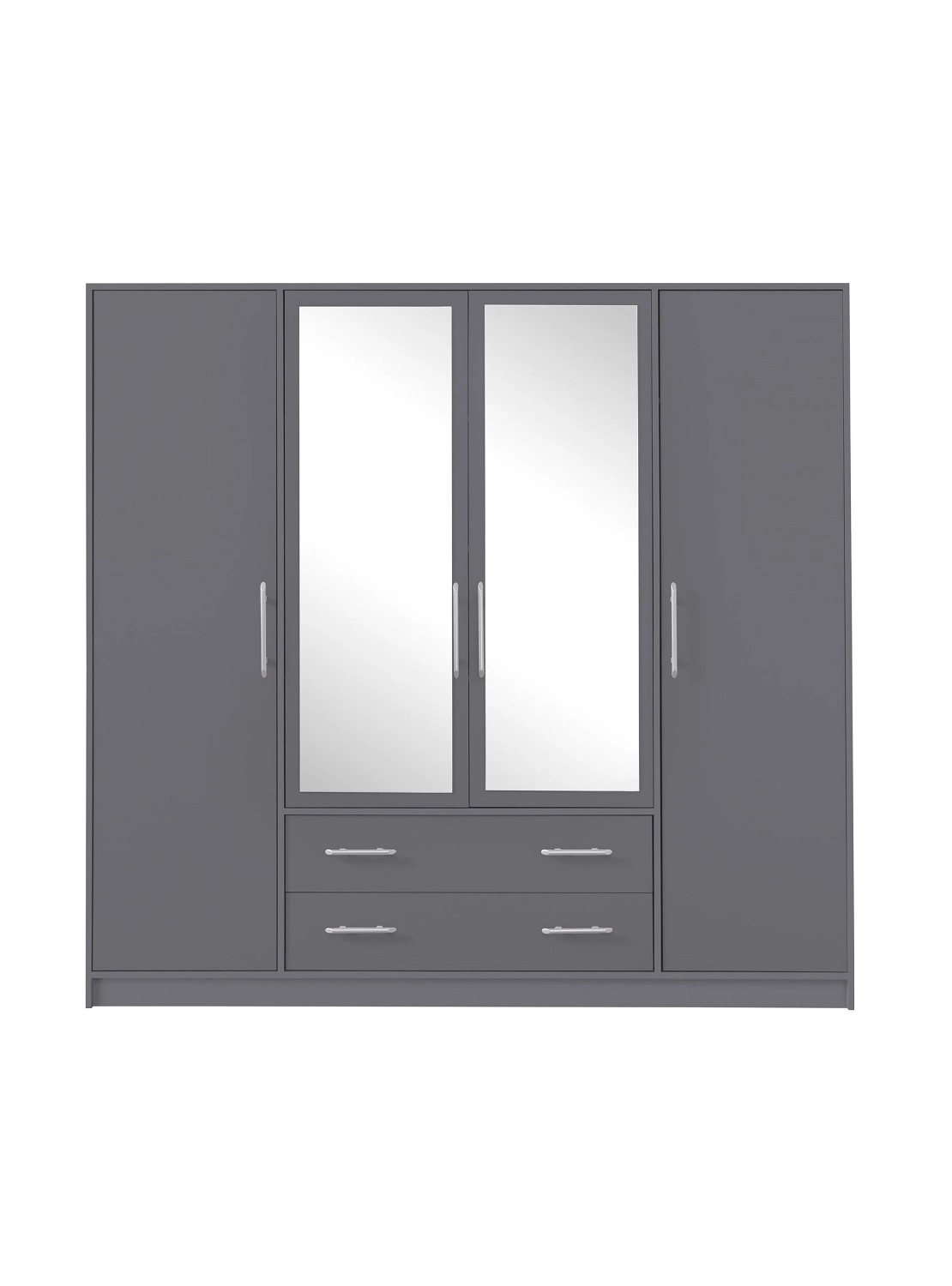 Skříň má výklopná dvířka s matným povrchem matný. Nábytek je vyroben z 4 dvířka a 2 zásuvky. Prostřední dveře jsou zakončeny velkým zrcadlo. Čelní strany skříní doplňují hliníkové úchytky. Šatní skříň je vyrobena z vysoce kvalitních z laminované desky, která se vyznačuje tím, že vysokou odolnost proti vnějším vlivům, jako jsou modřiny, nárazy a nešťastné škrábance.
